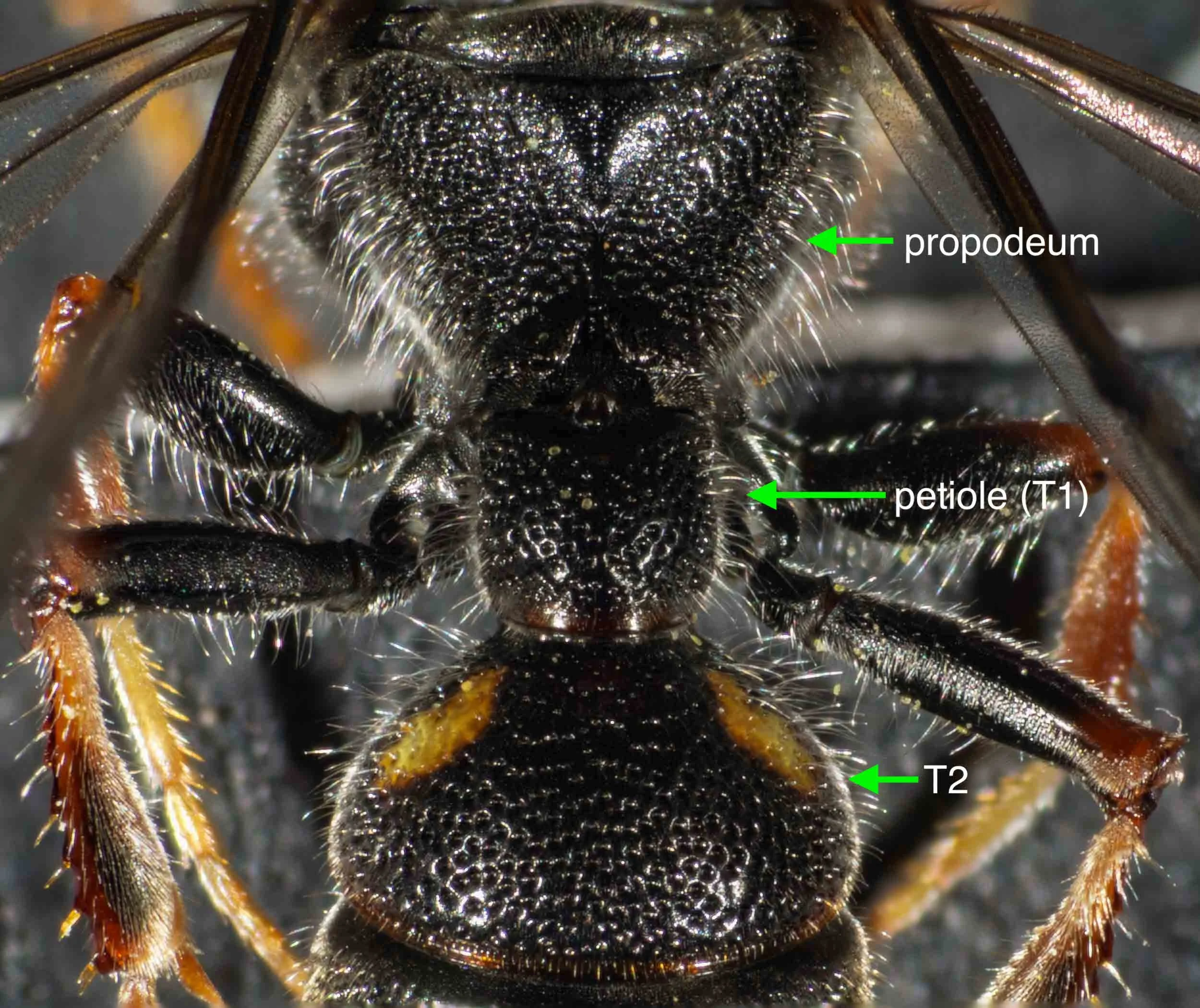 2. median length distinctly less than distance from posterior point (green arrow) to the posterior margin of the propodeum. In type A, the enclosure extends to or beyond the mid point of the propodeum.