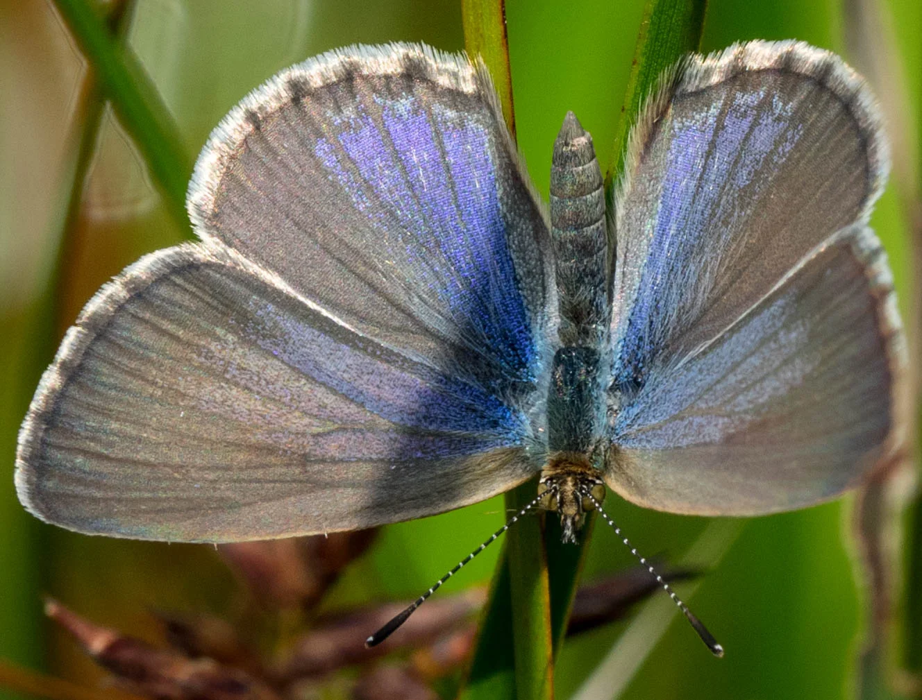 Several tiny blue butterflies, motionless atop the shaded sedges.