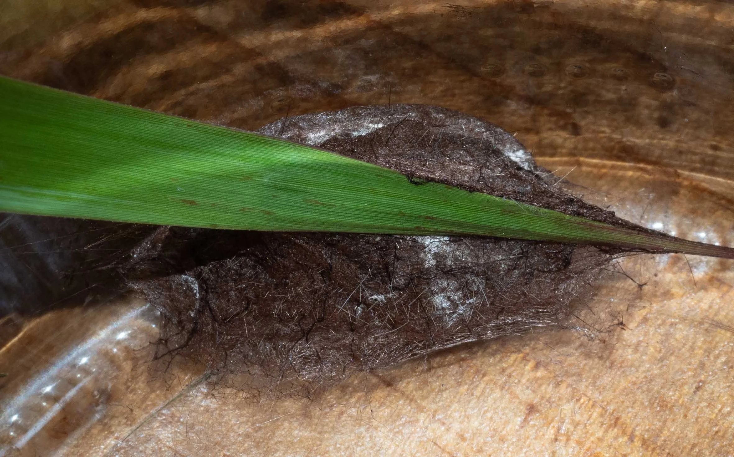 After devouring numerous long and tough grass leaves, it ceased moving and built a cocoon. The body hairs are recycled and continue to serve as protection for the developing moth.