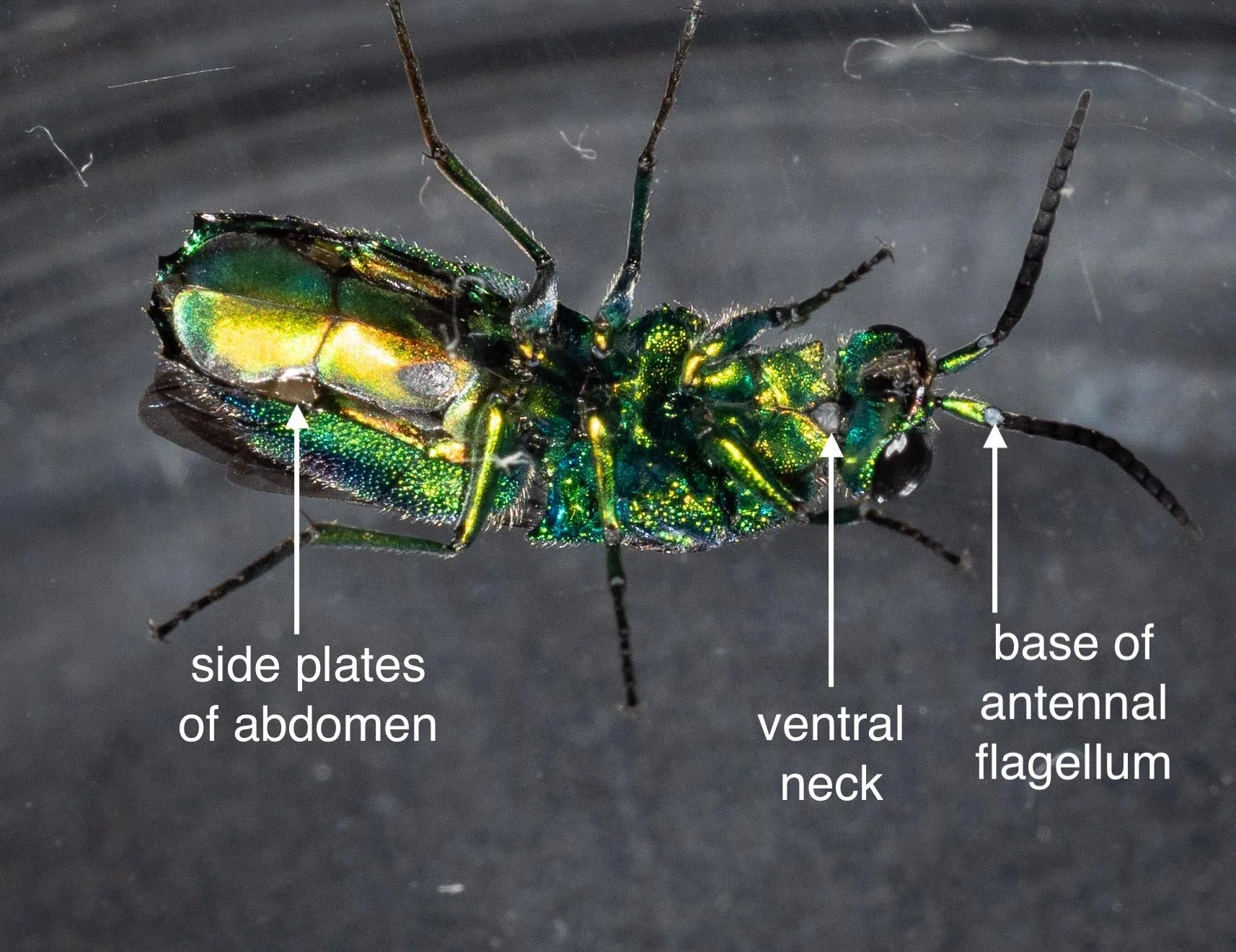 The reason, of course, is that the darkly pigmented exocuticle lies beneath the epicuticle. So the black pigmented layer serves as a wonderful backdrop to the overlying structural iridescence … absorbing any stray light that passes through the epicuticle, leaving just the pure structural reflectance.