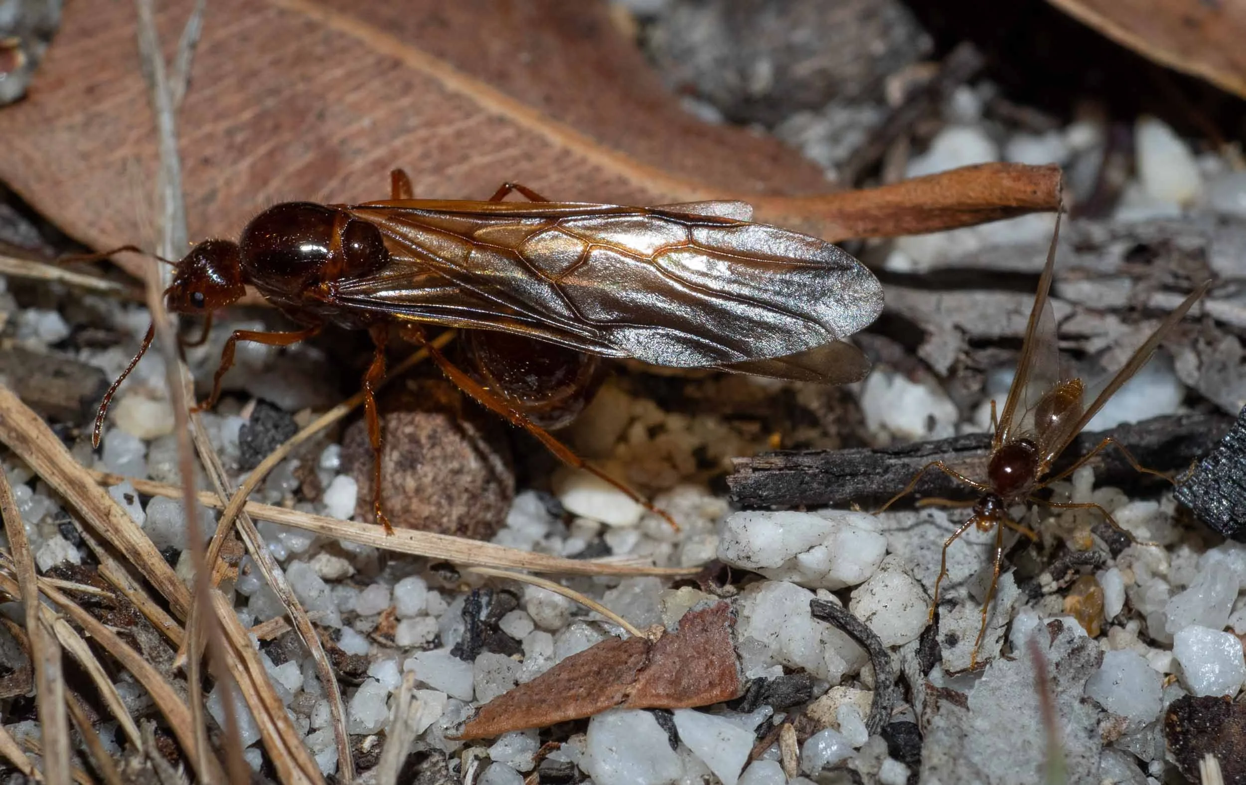 Pair of Aphaenogaster longiceps alates, immediately after landing and uncoupling. The large female (left) is at least 10mm long, while the slender male (right) was not much larger than the workers, at 5-6mm. (18/10/2021)