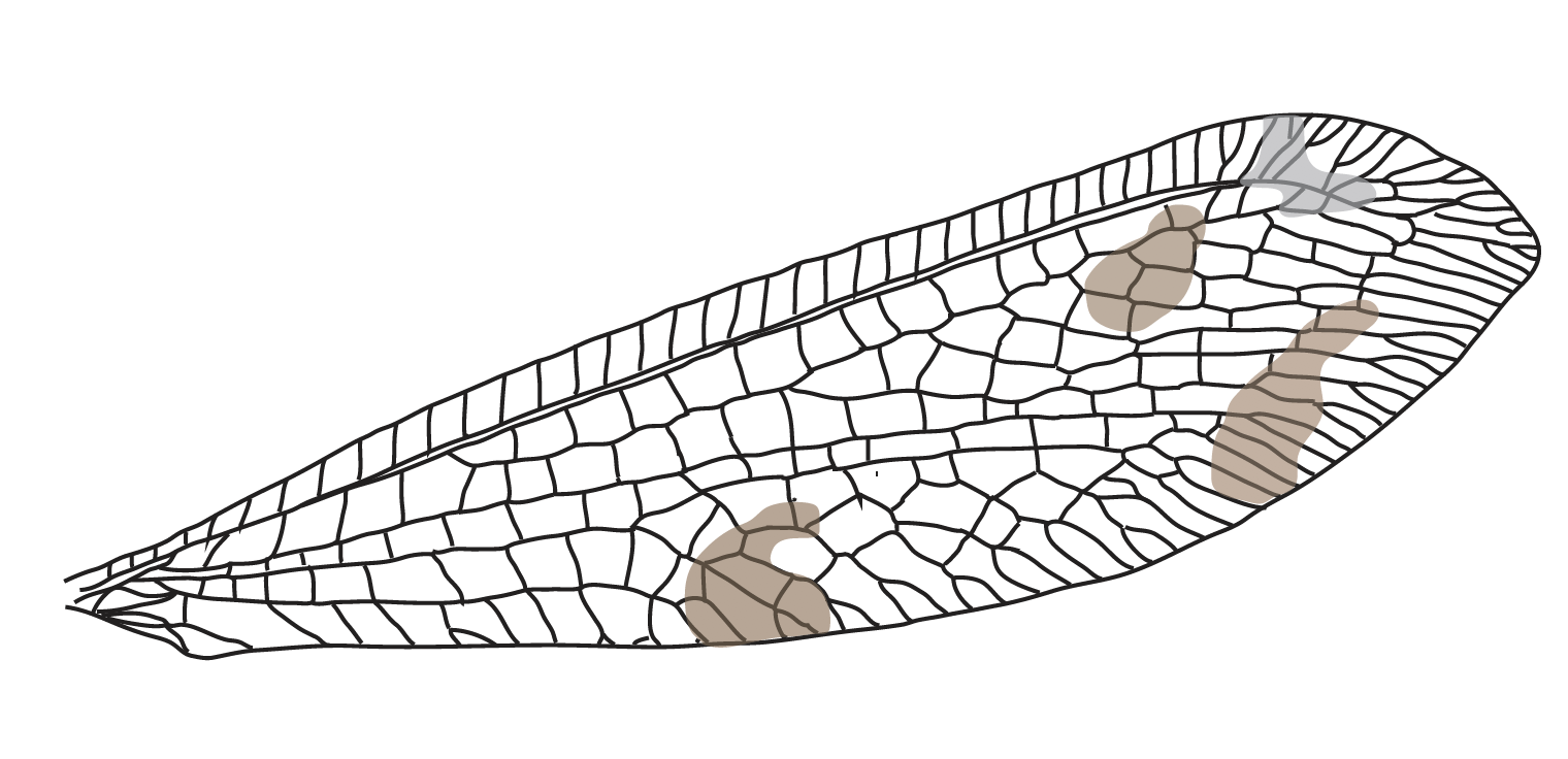 Wings: mostly longitudinal veins with alternating dark and pale lengths; many crossveins black; pterostigma white; shading in FW greyish brown. - matches