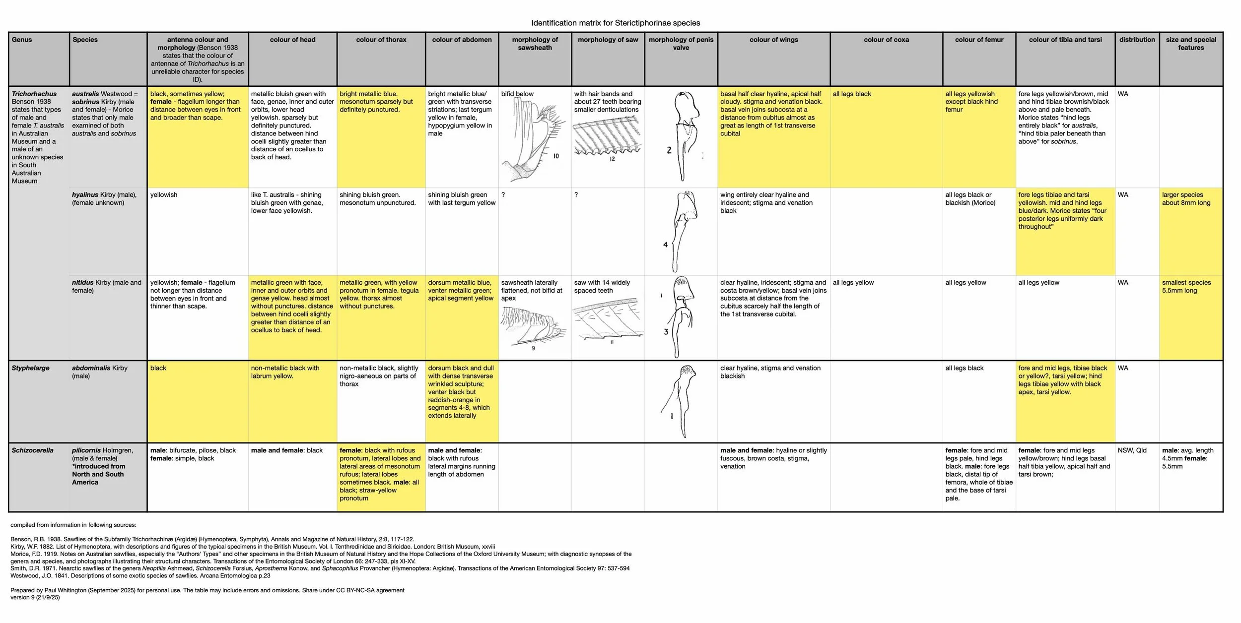 The matrices below are designed to aid identification of all Australian species in the 3 genera that comprise the Sterictiphorinae - Trichorhachus, Styphelarge and Schizocerella. The last genus is represented by one species, Schizocerella pilicornis, which was introduced to Australia from North/South America.