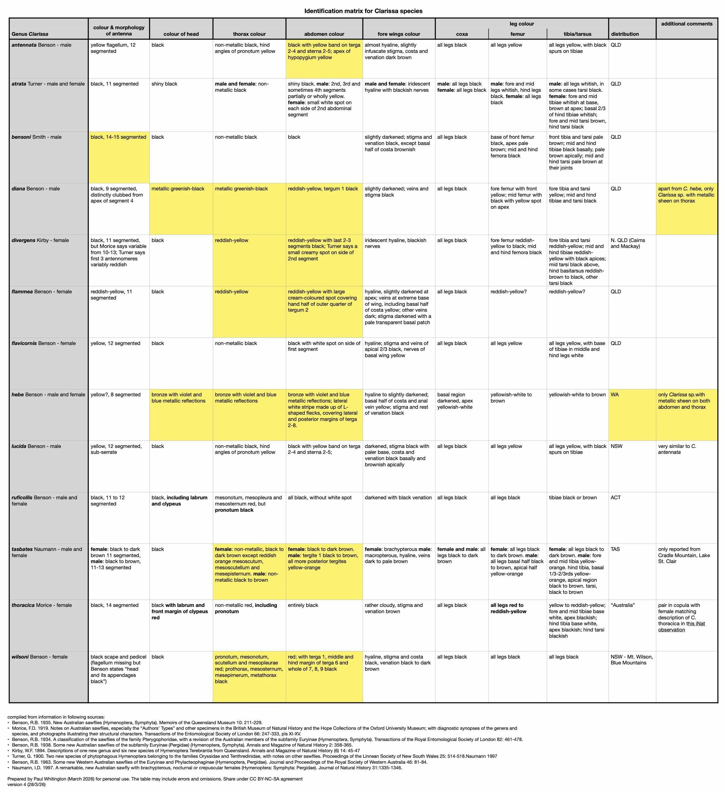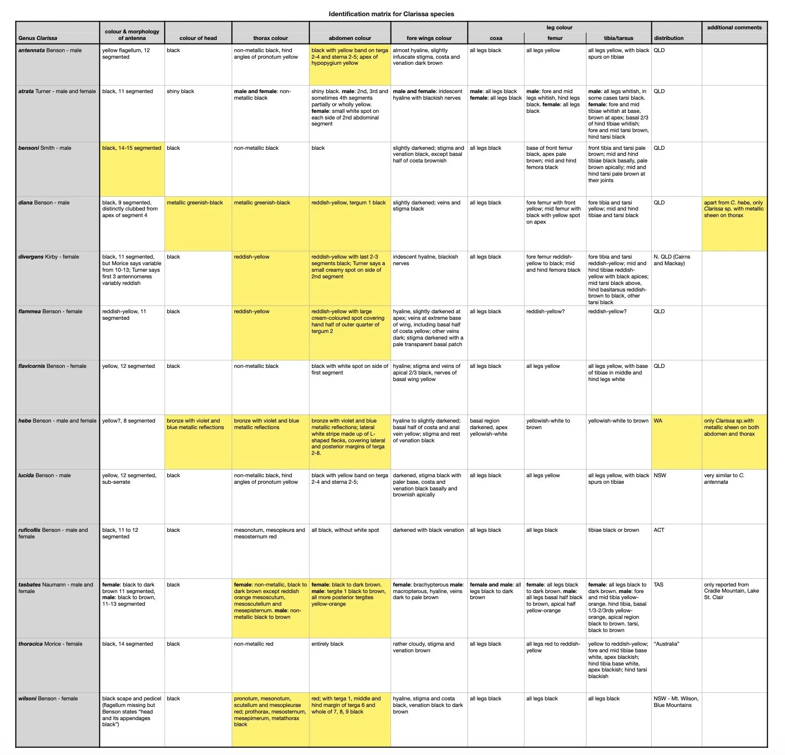 The matrix below is designed to aid identification of species in the genus Clarissa, which has the following diagnostic features (see Euryinae genera matrix for diagrams illustrating these features):