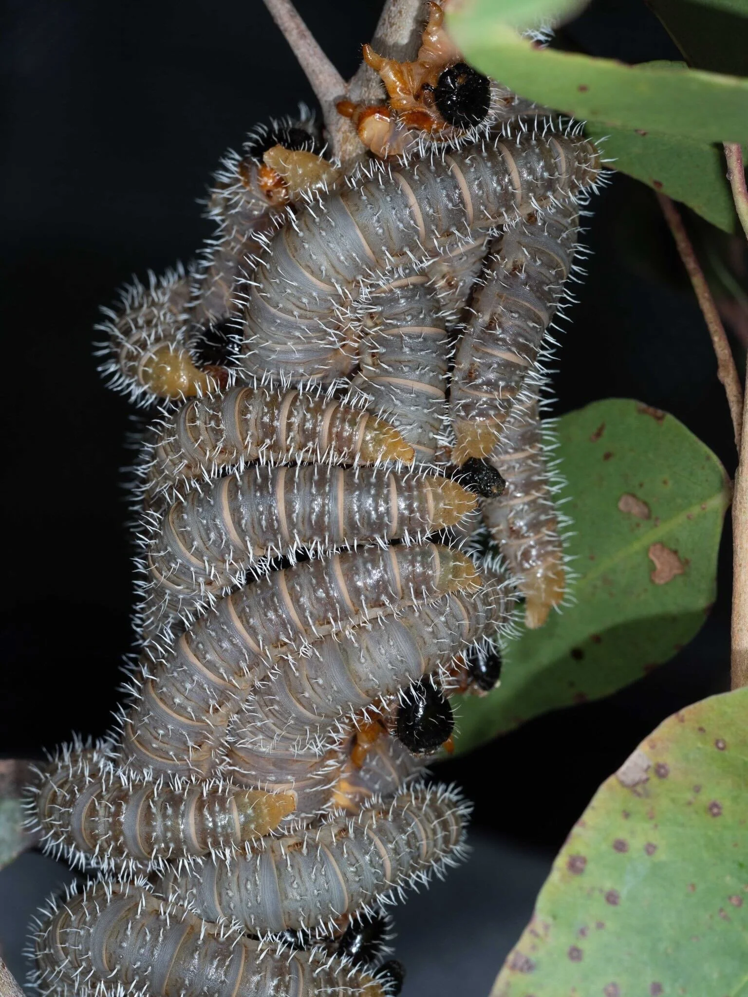 A large cluster (at least 20) of larvae was found in an upper branch of a juvenile eucalypt (probably E. globoidea), just behind the biolytix irrigation area. They were around 5cm long and a distinctive grey colour.