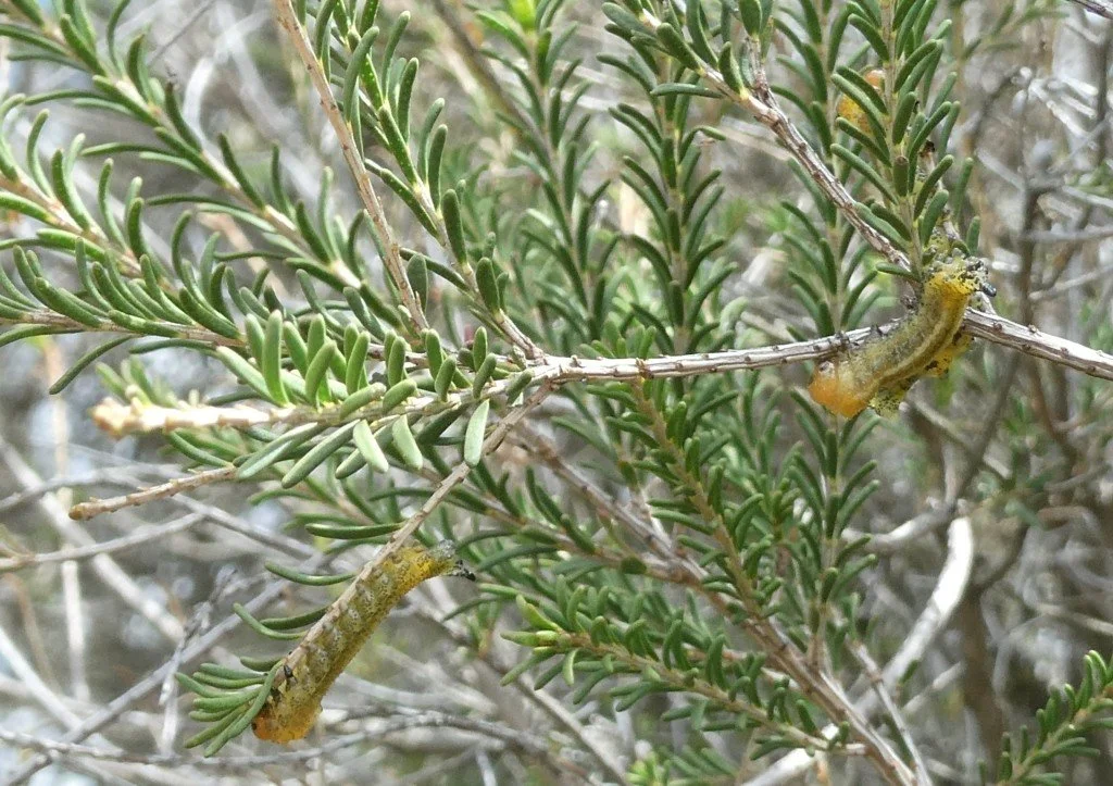 Roger reports widespread defoliation of Melaleuca parvistaminea by similar larvae at various points along the Kings Highway - shown in photos below.