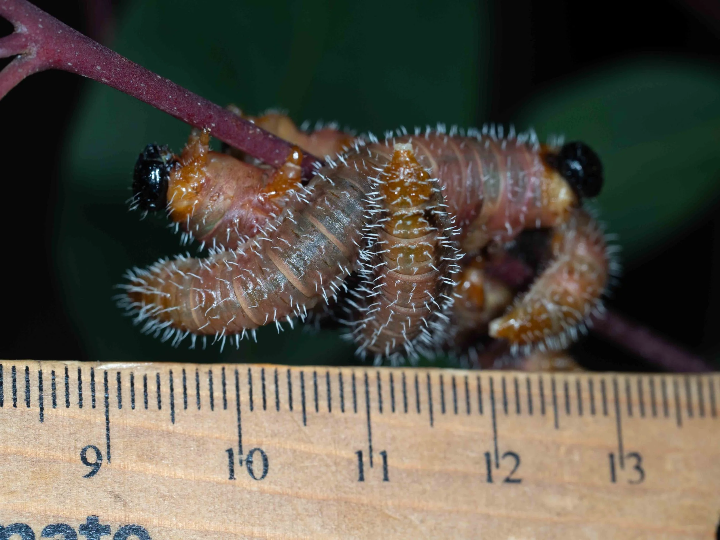 We collected these larvae and transferred them to a metal cage. They grouped together quickly and began feeding on the vegetation on their branch.