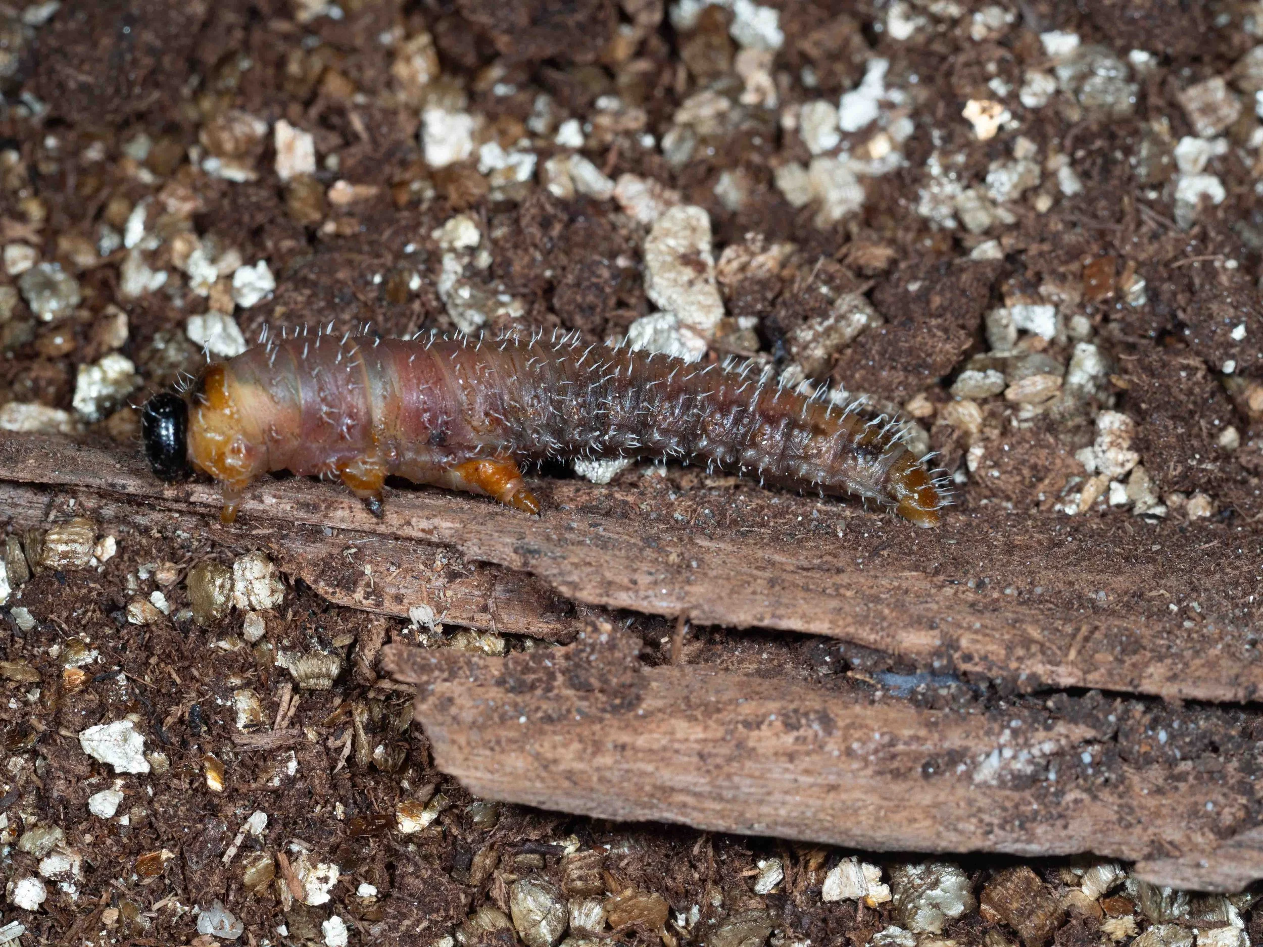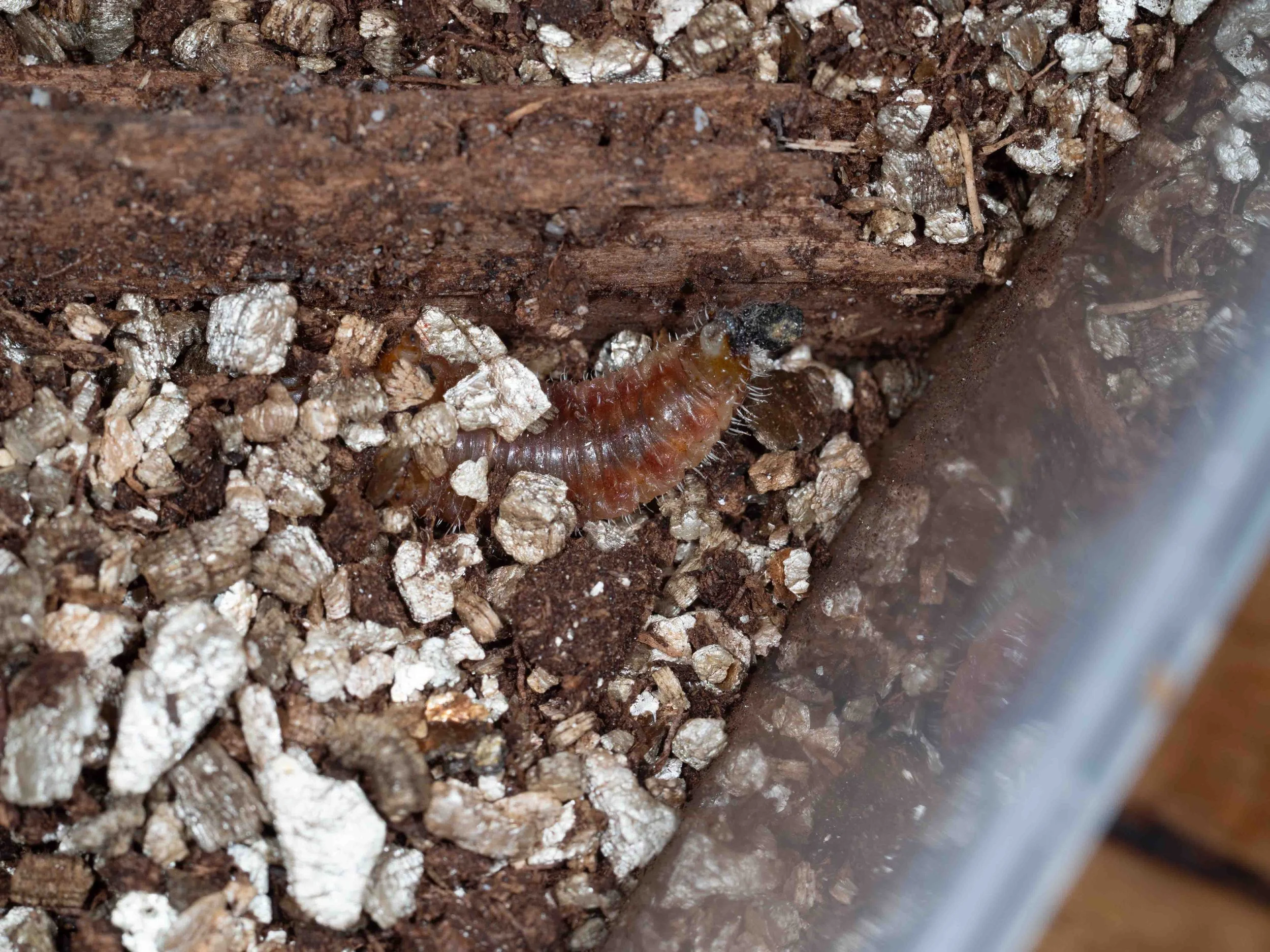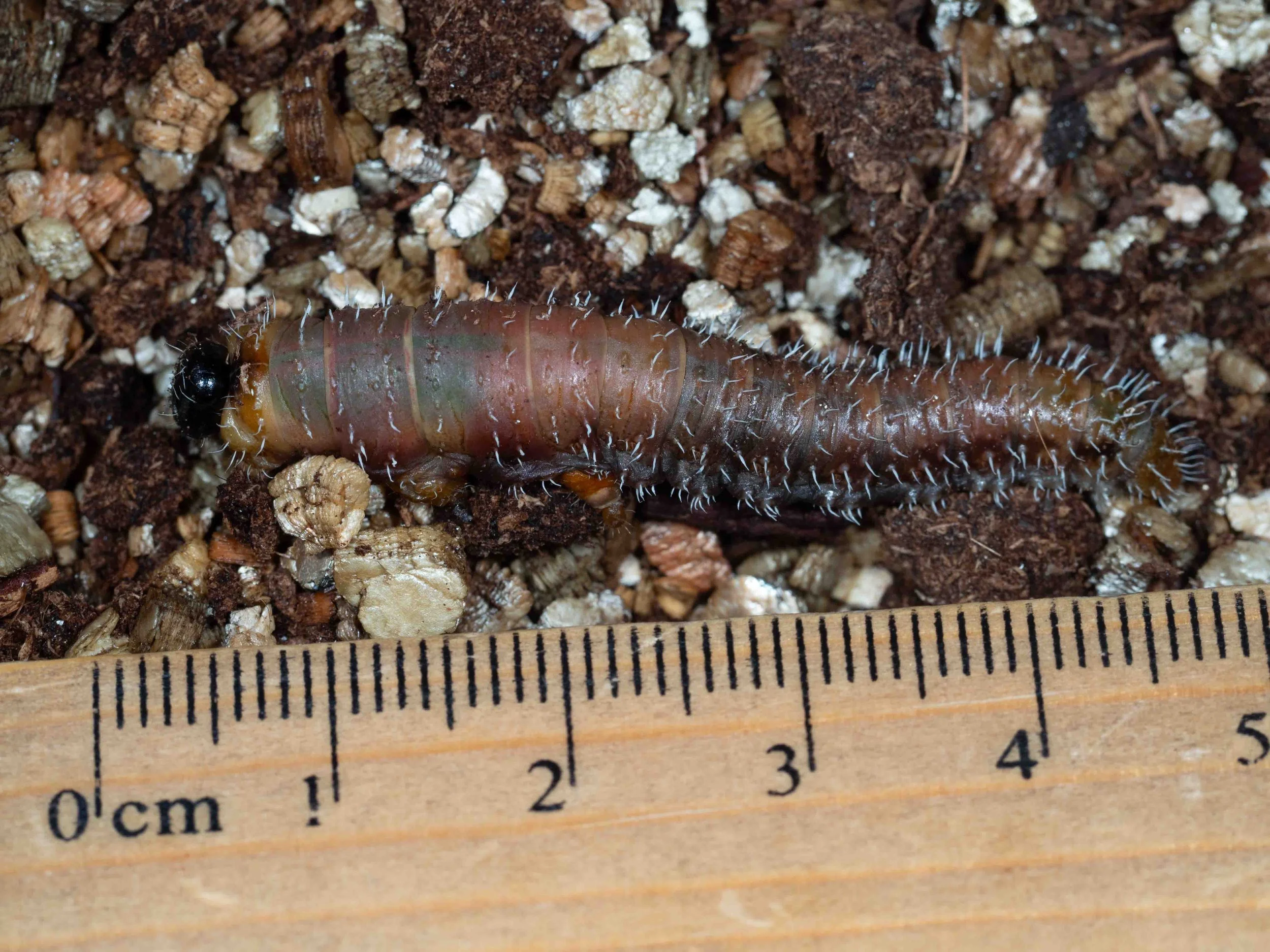 Another larva seen crawling around on the bottom of the cage. This was the last one to be added to the cage and is the largest of the 4 larvae.