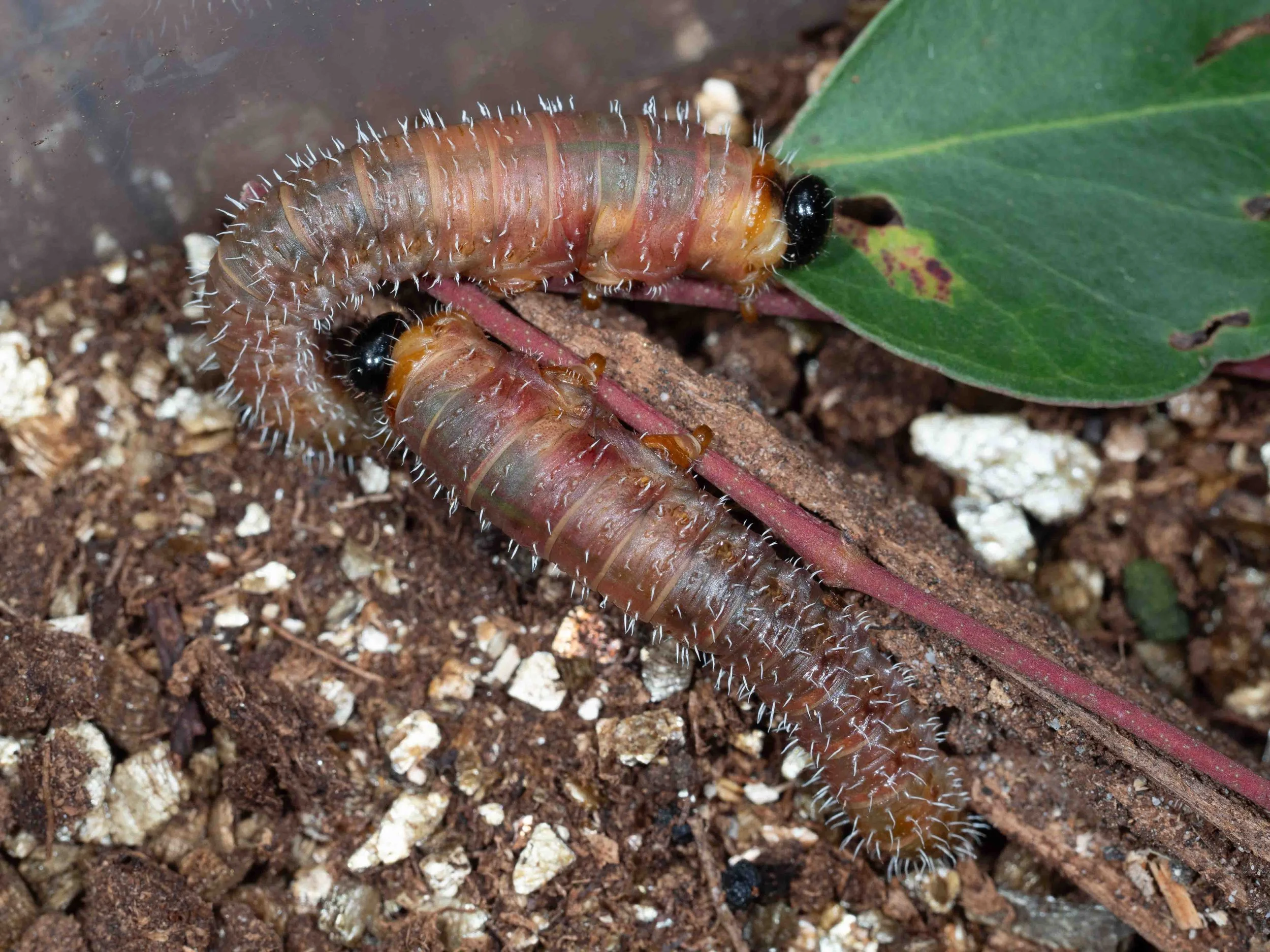 The pair in the cage still feeding well, sometimes together, sometimes separately. No sign of the two larvae that went to ground previously.
