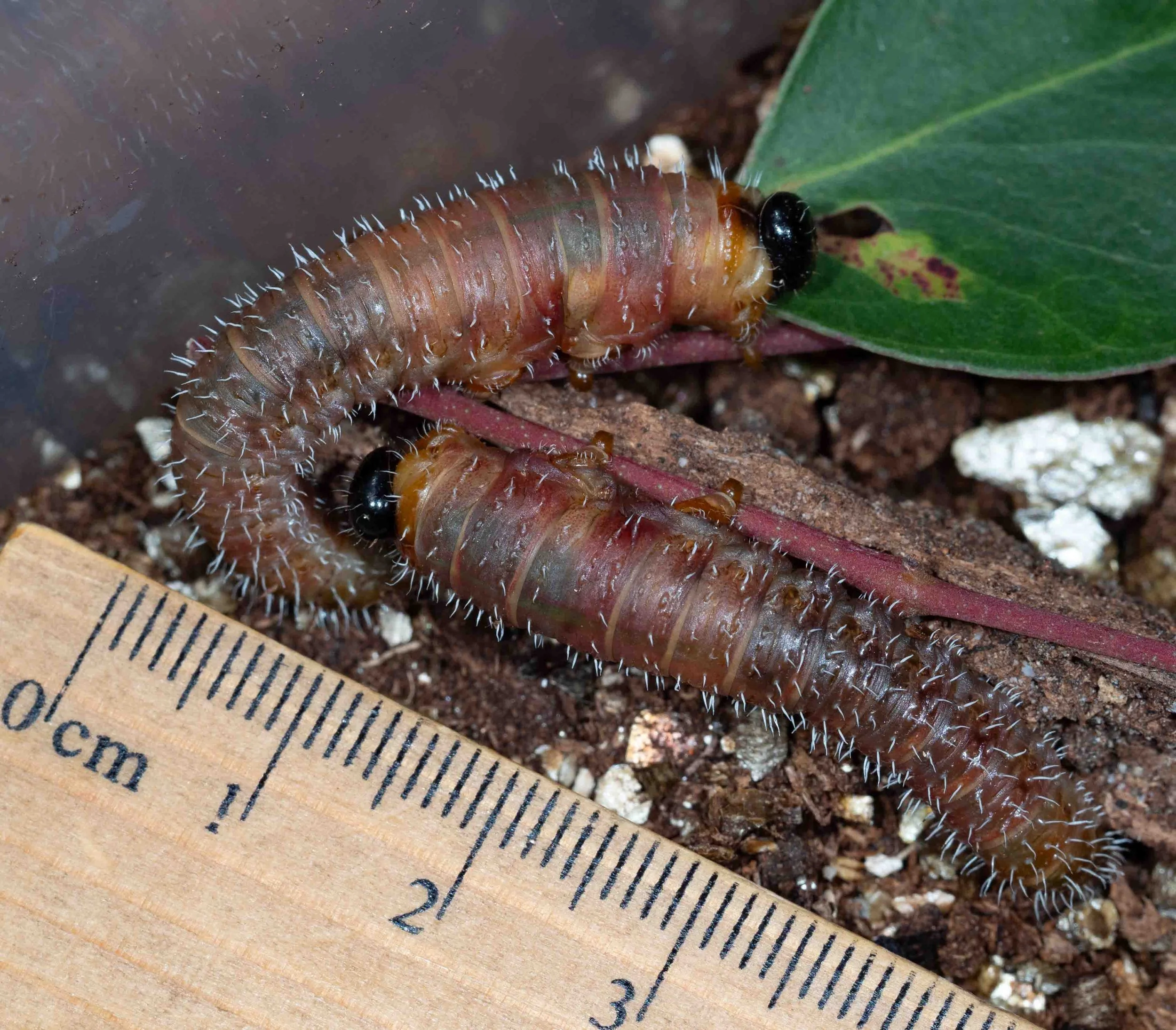 The two remaining larvae in the cage were unsettled and we moved them to the tub. However they showed no signs of digging and when fresh vegetation was placed in the tub, they crawled onto it and started feeding. (photos below). We returned them to the cage with a branch of fresh leaves and they continued to feed.