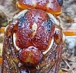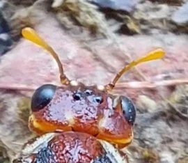 scutellum with shallow medial furrow, making midline slightly concave; broader than long, almost square; with obtuse hind lobes; irregularly but thickly punctured; colour ranges from yellow-orange to dull rufous to yellowish-brown; sometimes with a creamy-white patch in the middle - yes, consistent morphology with this range of colours seen in different individuals