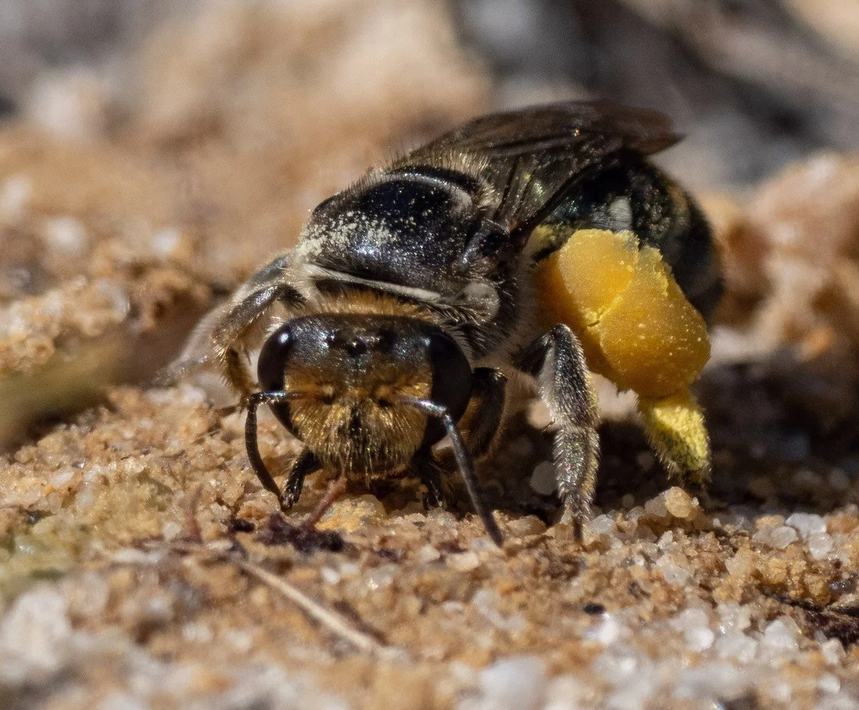 But if you see them hauling food, there’s no question. Crabronids eat meat, bees are vegetarian! That only works for the identification of females, but it’s a start. Note that crabronids will sometimes be heavily covered in pollen, but that’s just an accident. Most adults regularly feed on nectar … but they only collect meat for their offspring. Bees carry pollen, often visibly packaged on their bodied.