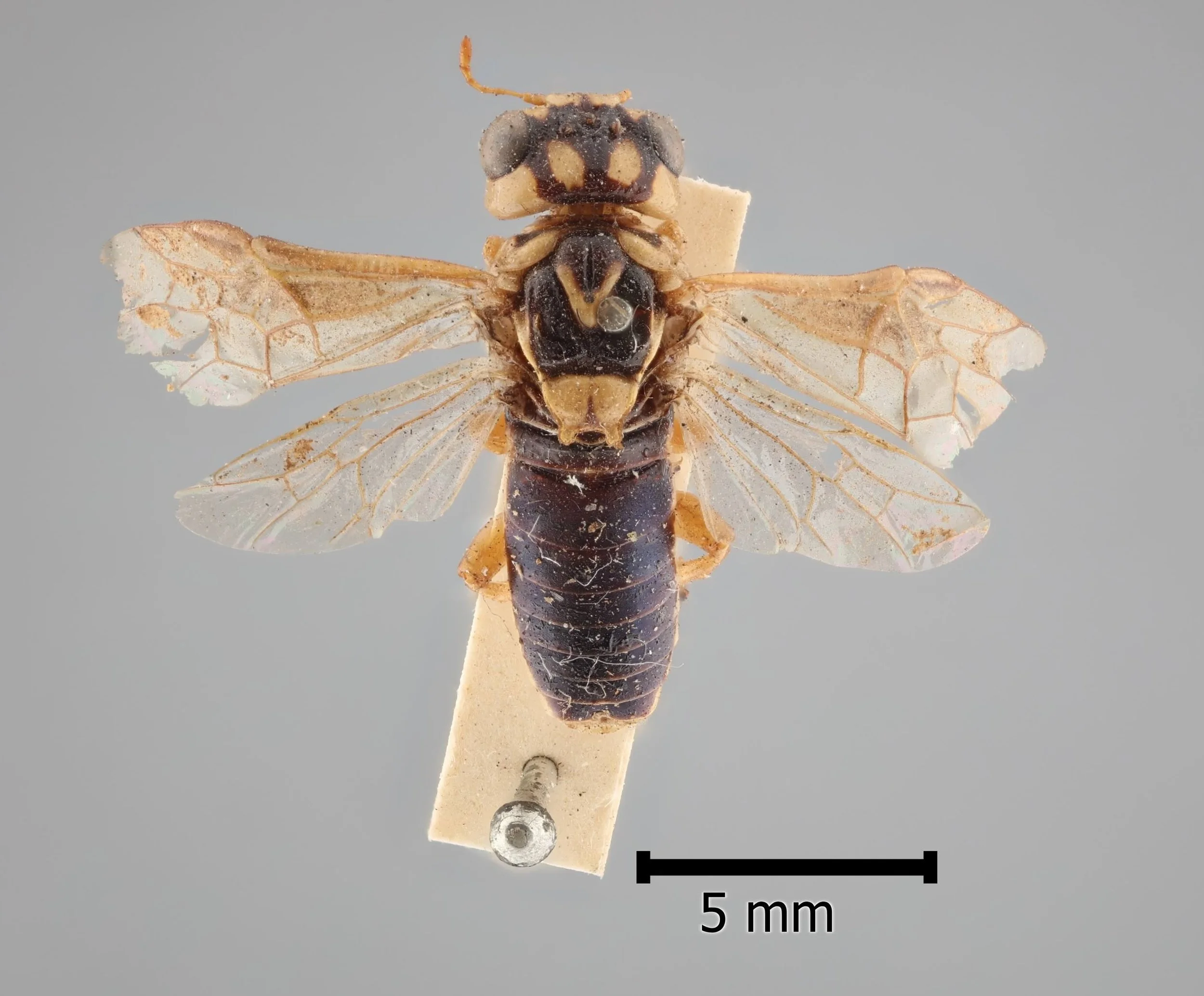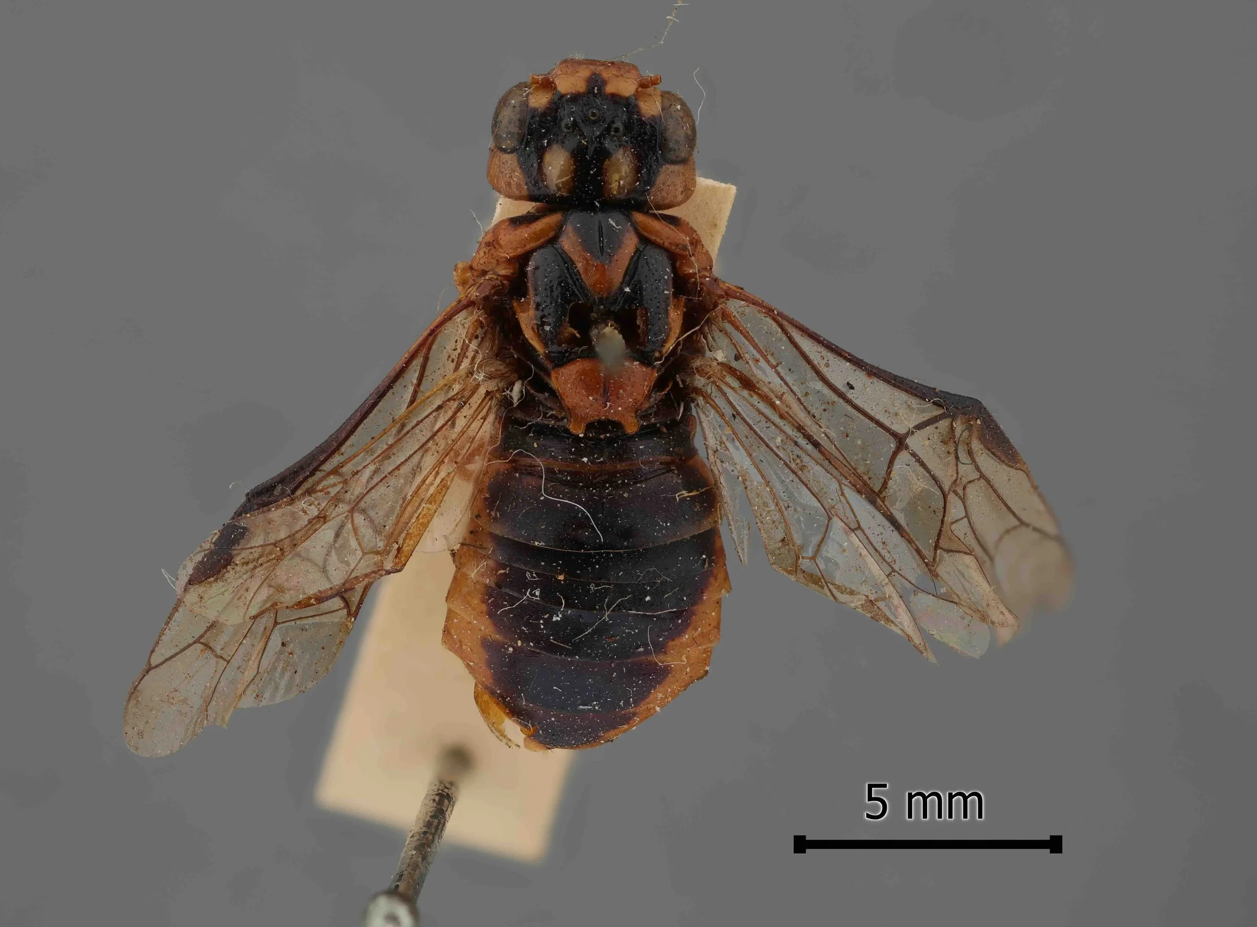 Specimen A is a female, collected by Marianne Broug (iNaturalist observation) at Belair SA in January 2026 (specimen #PW076). It was found dead on a road. Antennae and some leg segments are missing, the mesonotum split but otherwise the insect is intact. While lacking antennae, it shows the following characters which are diagnostic of genus Xyloperga: scutellum convex, with well developed hind lobes; head swollen behind the eyes; clypeus with a transverse fold in the middle.