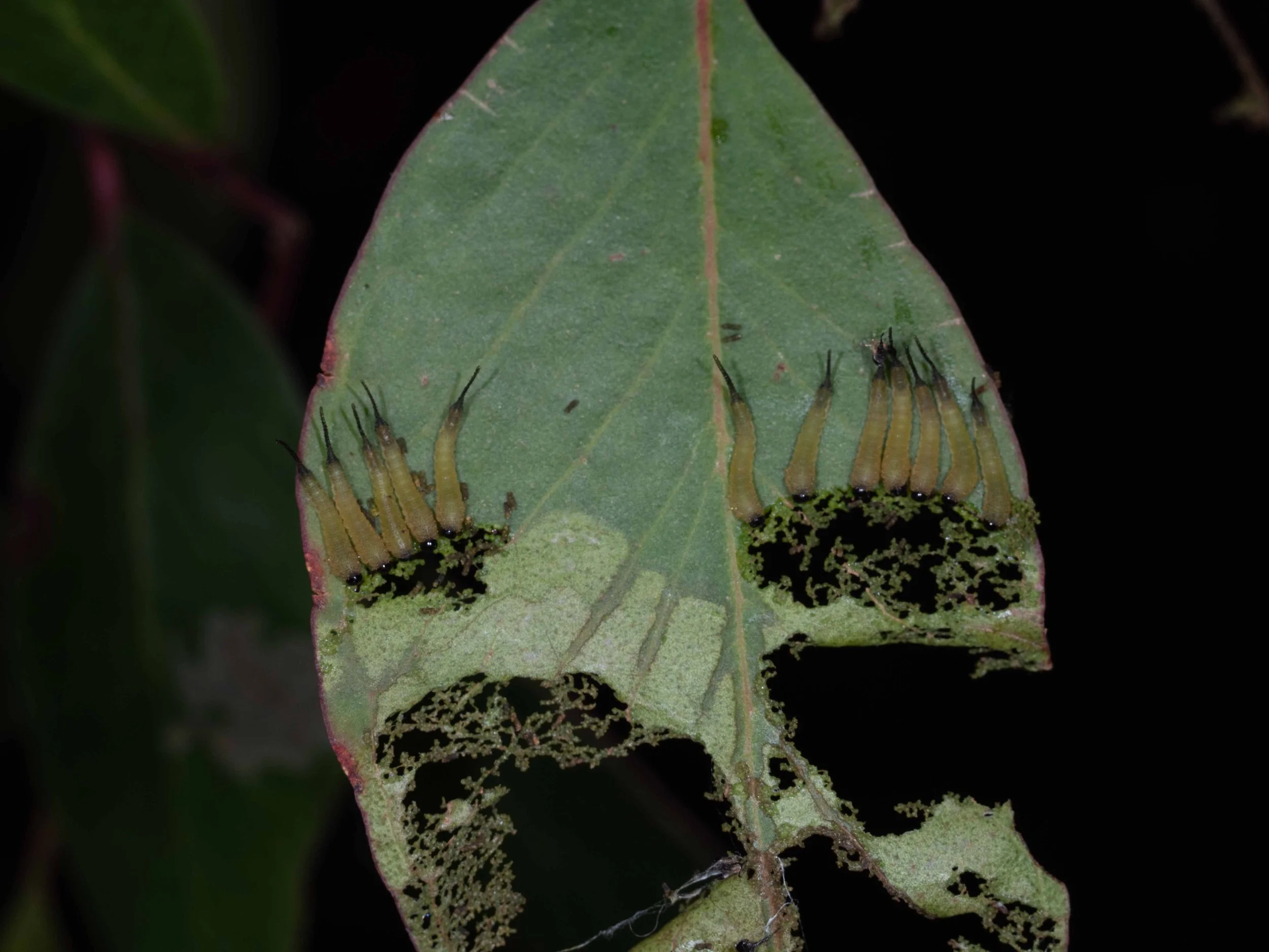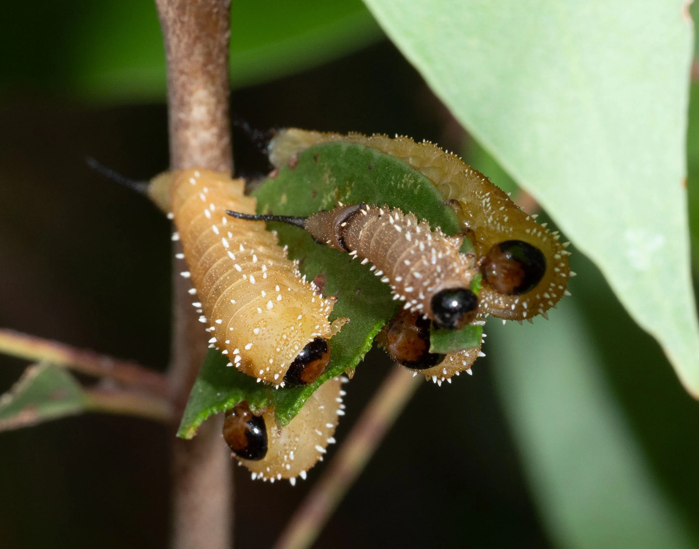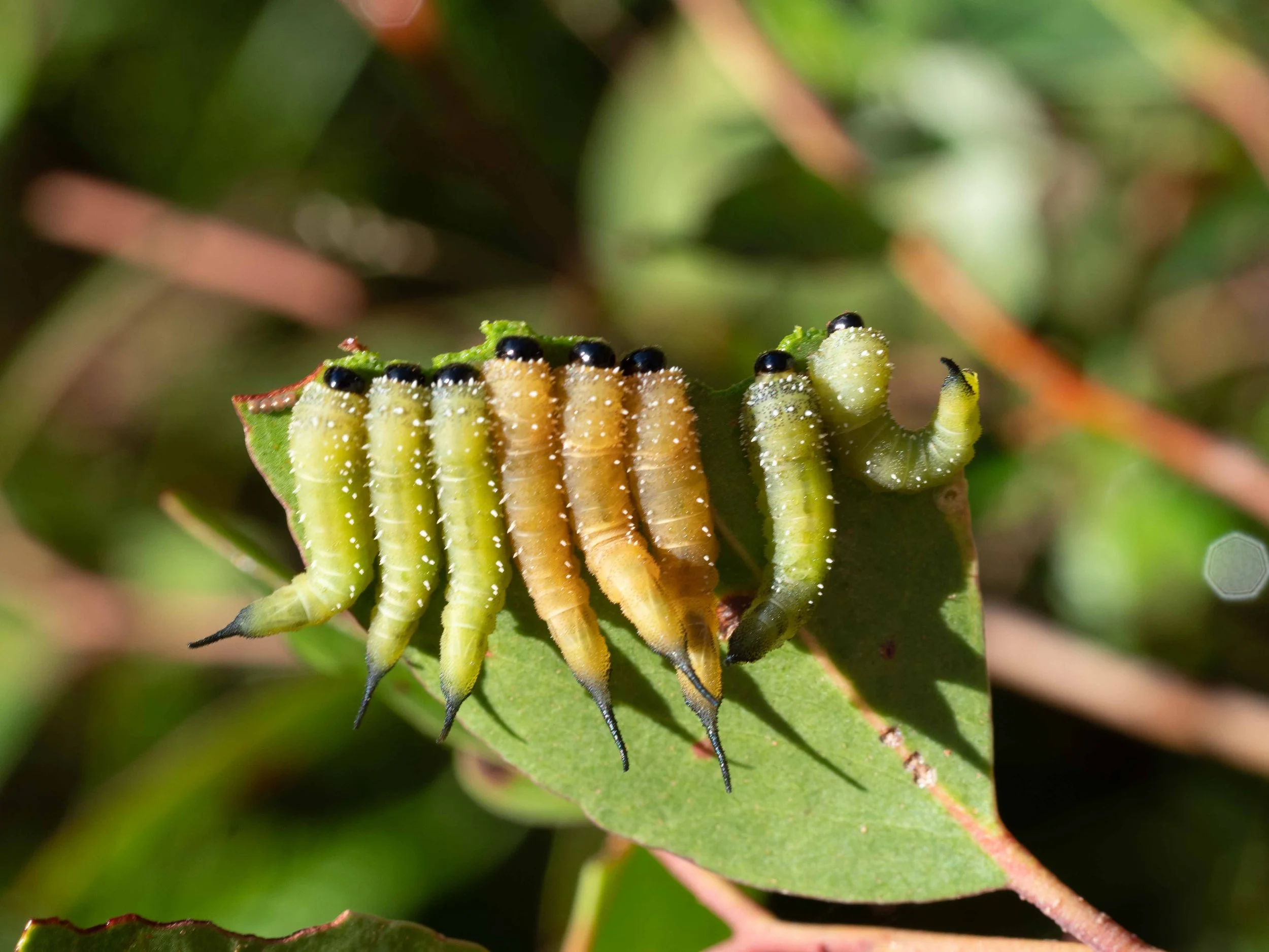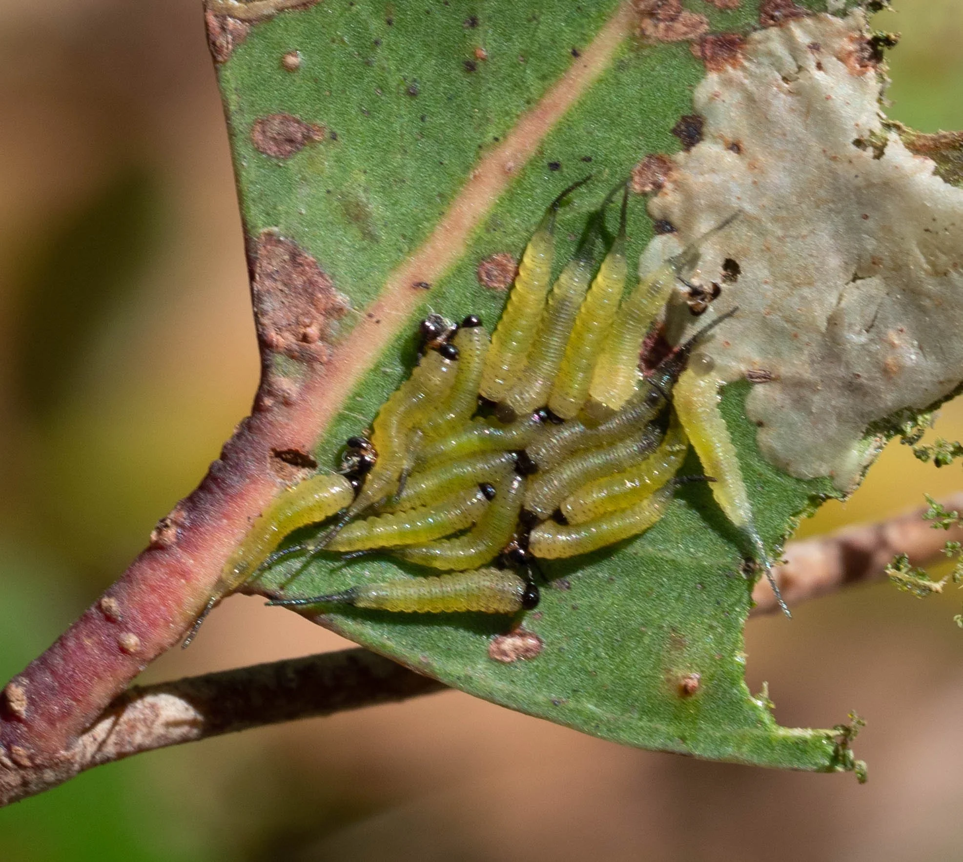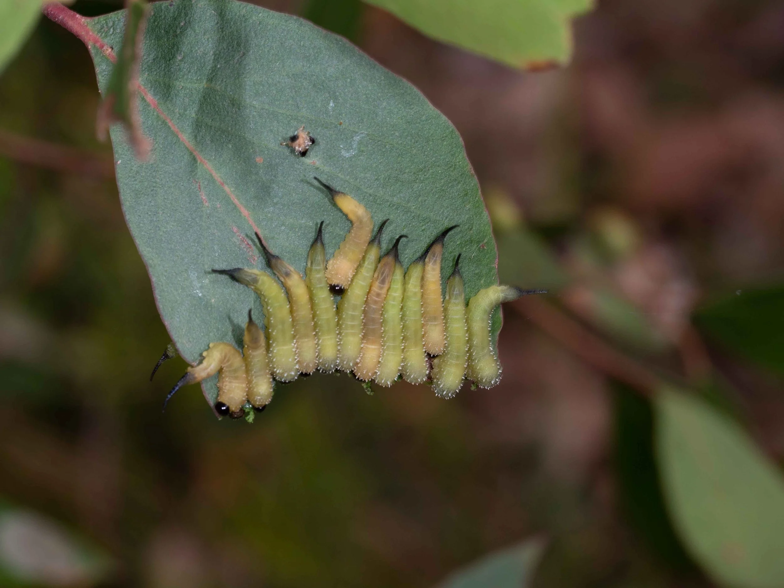 Five larvae seen feeding on a leaf on a epicormic branch of Eucalyptus globoidea tree with a broken trunk in driveway, near new water tank