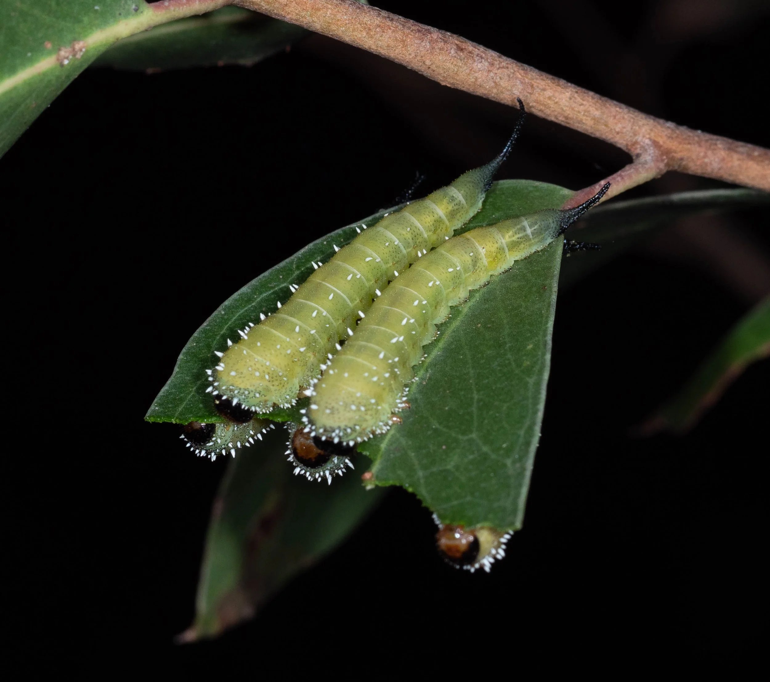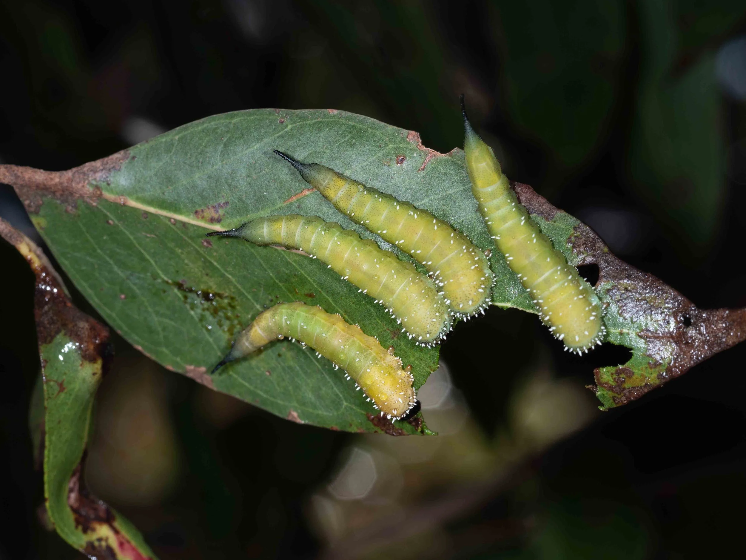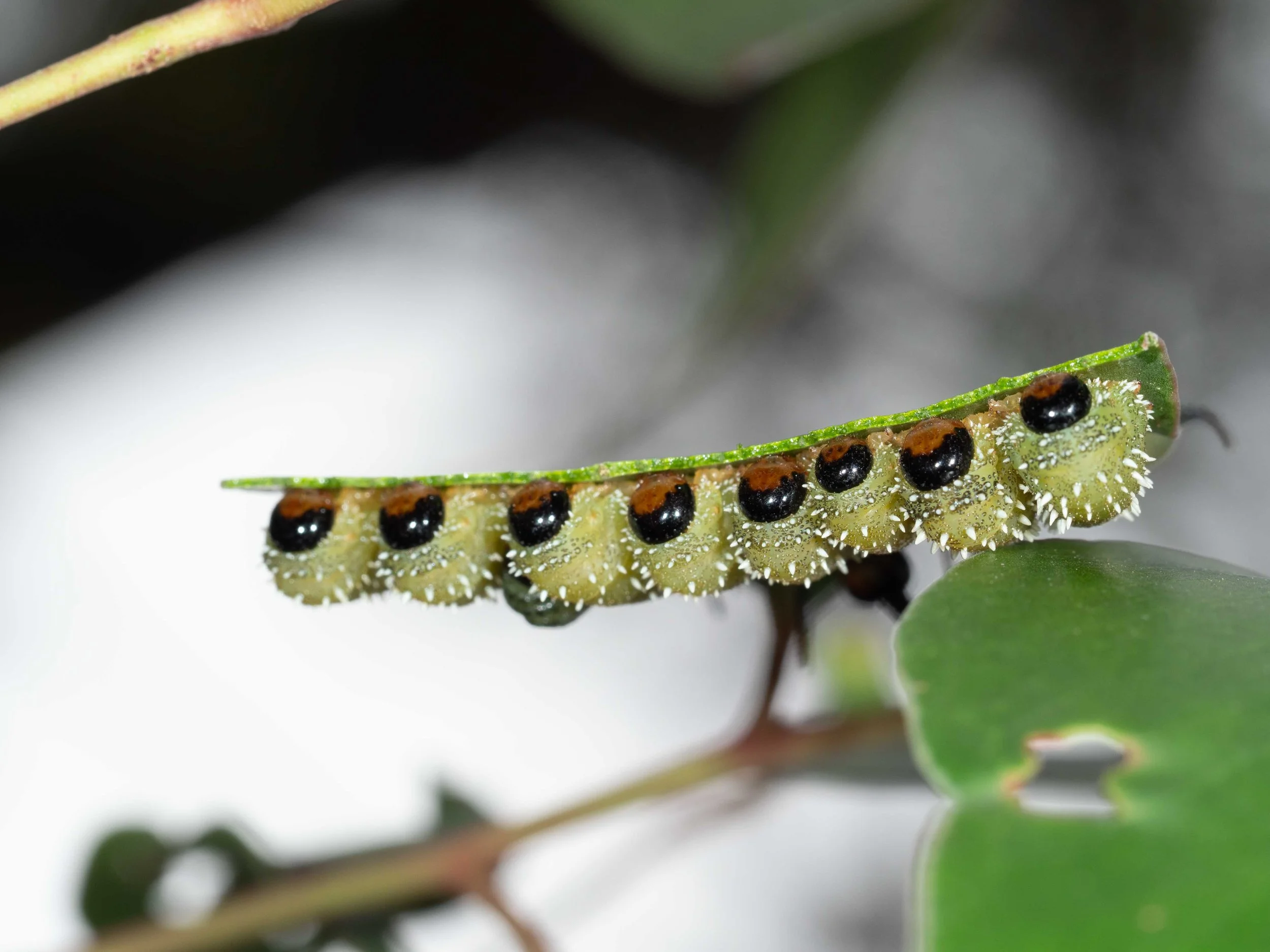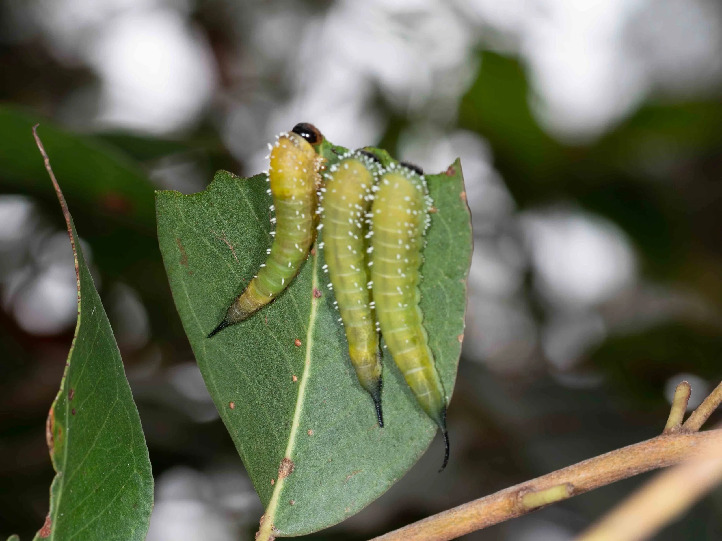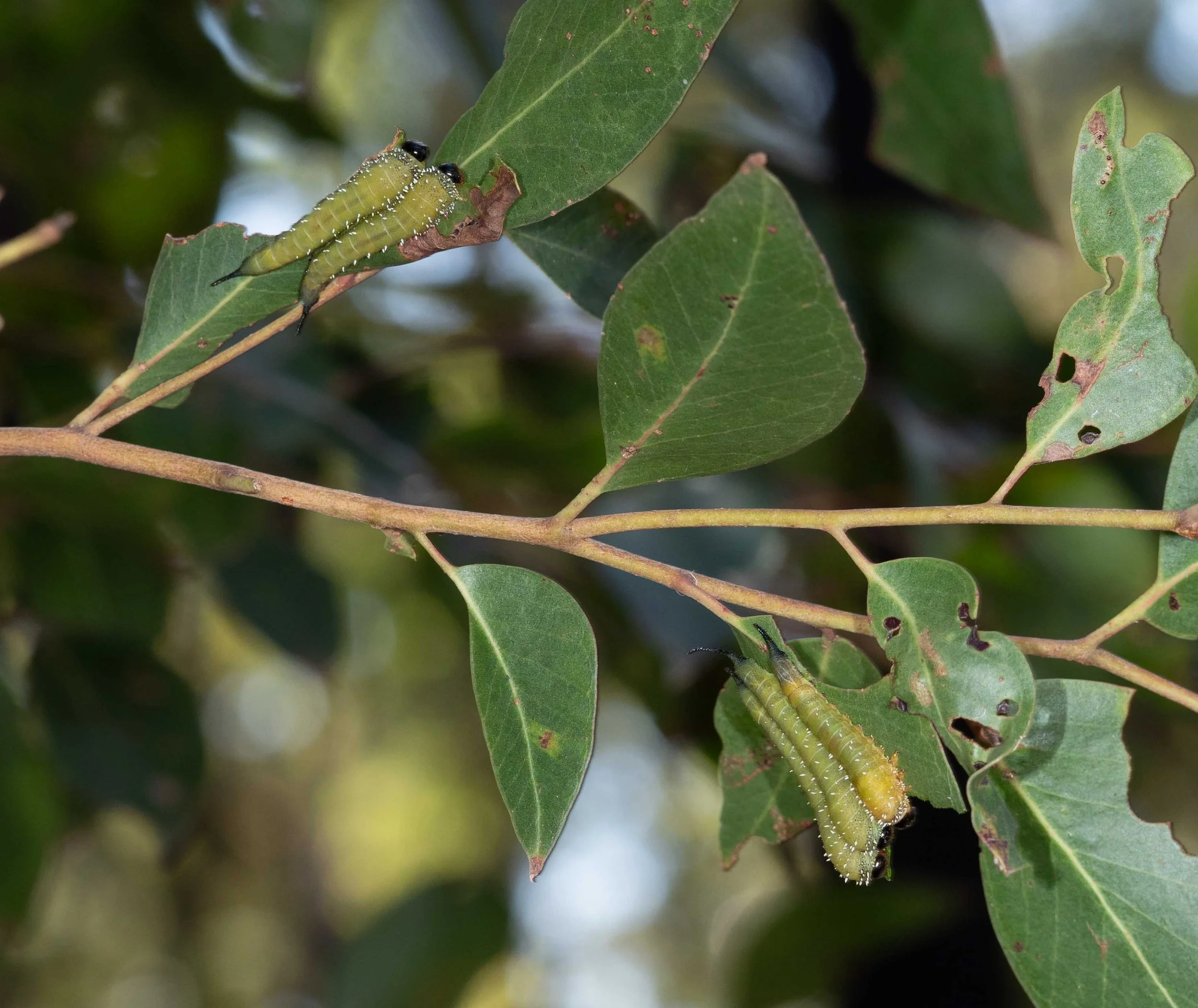 Five larvae seen feeding on a leaf on a epicormic branch of Eucalyptus globoidea tree with a broken trunk in driveway, near new water tank