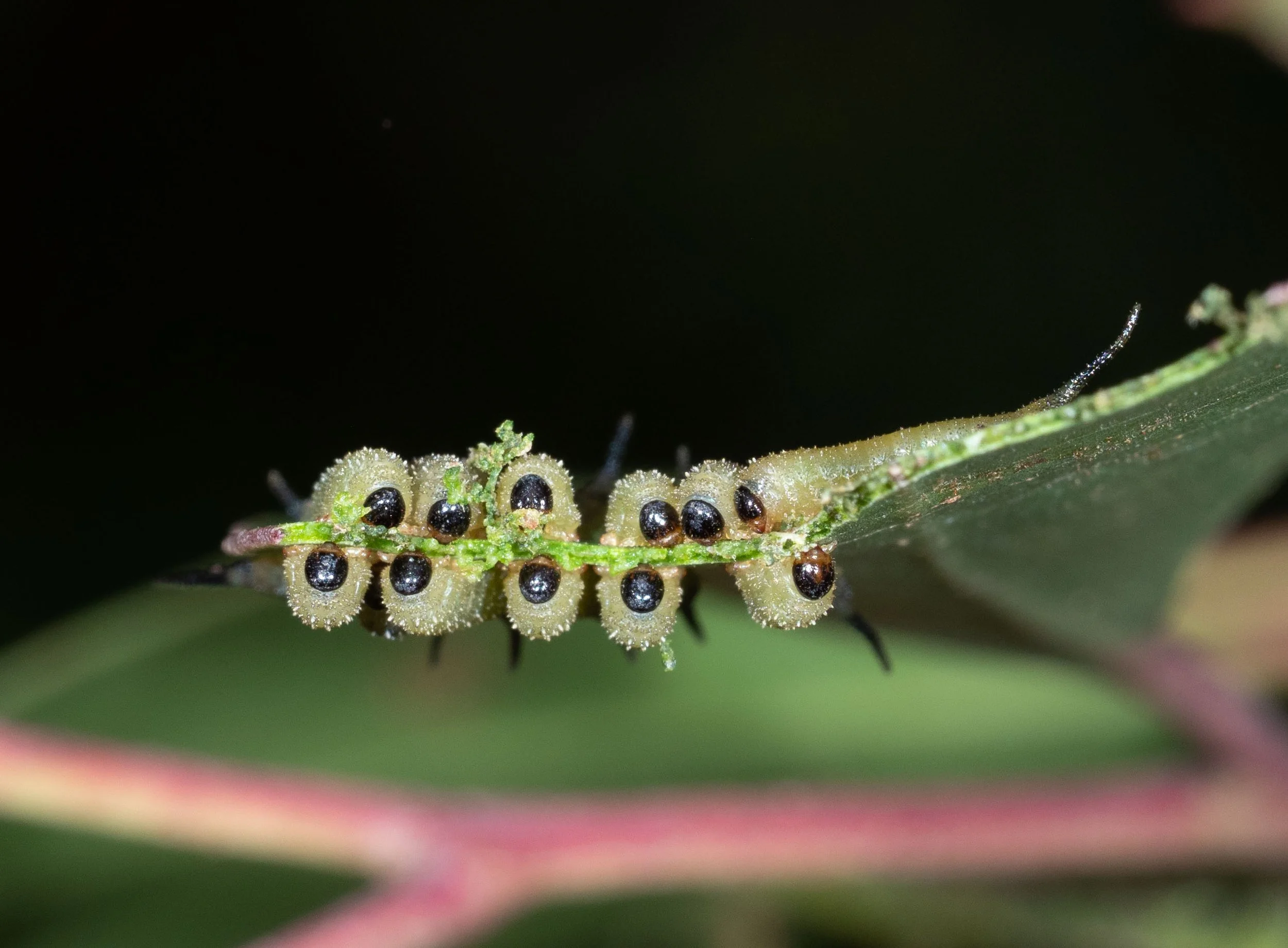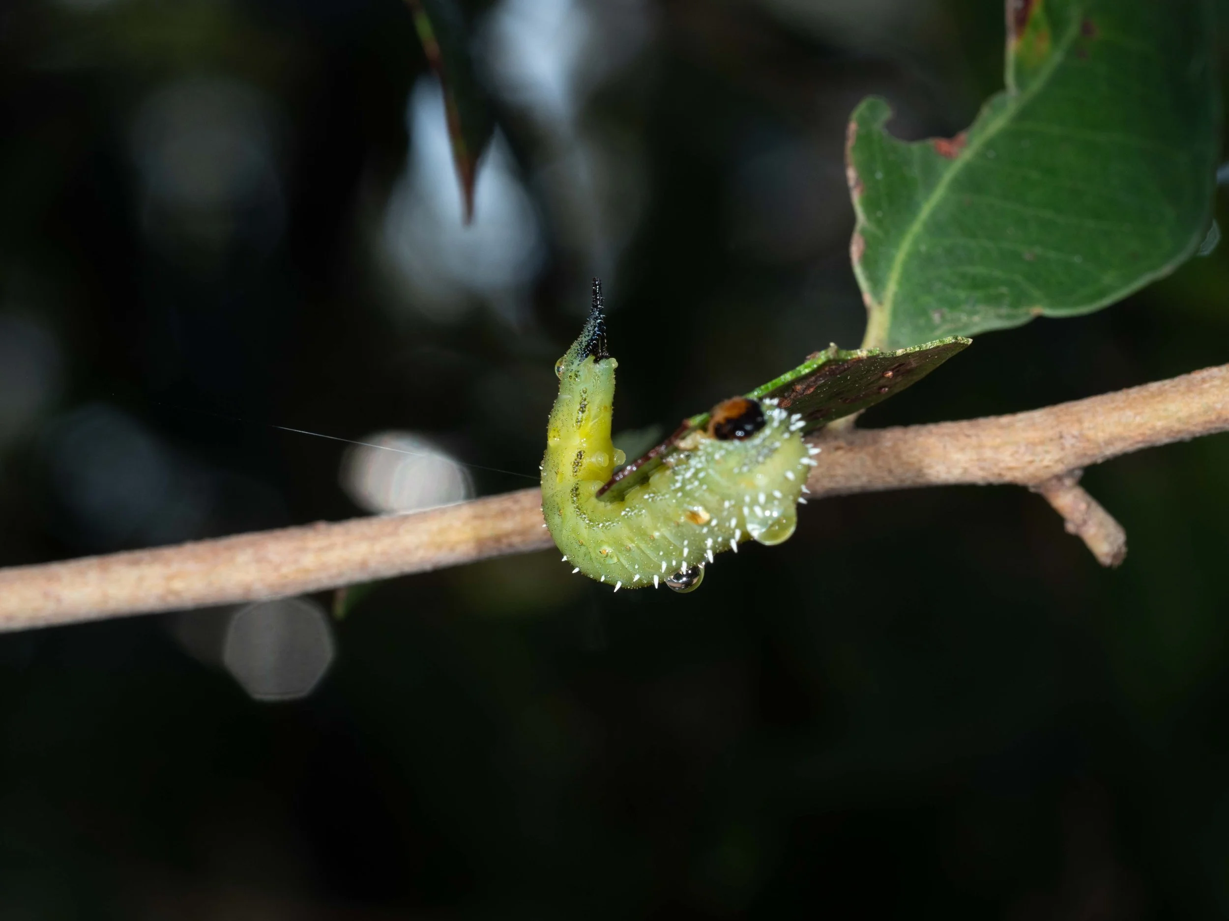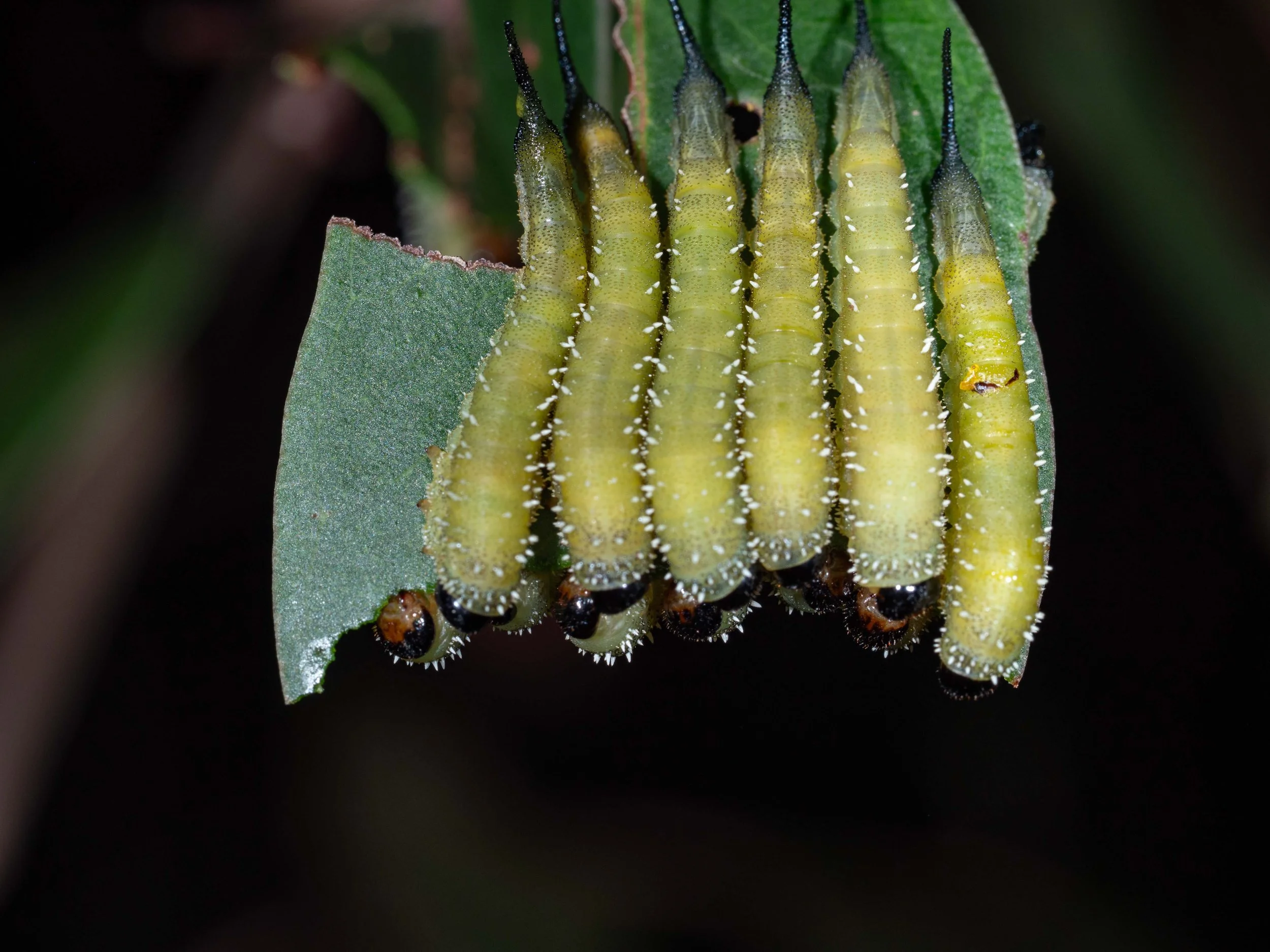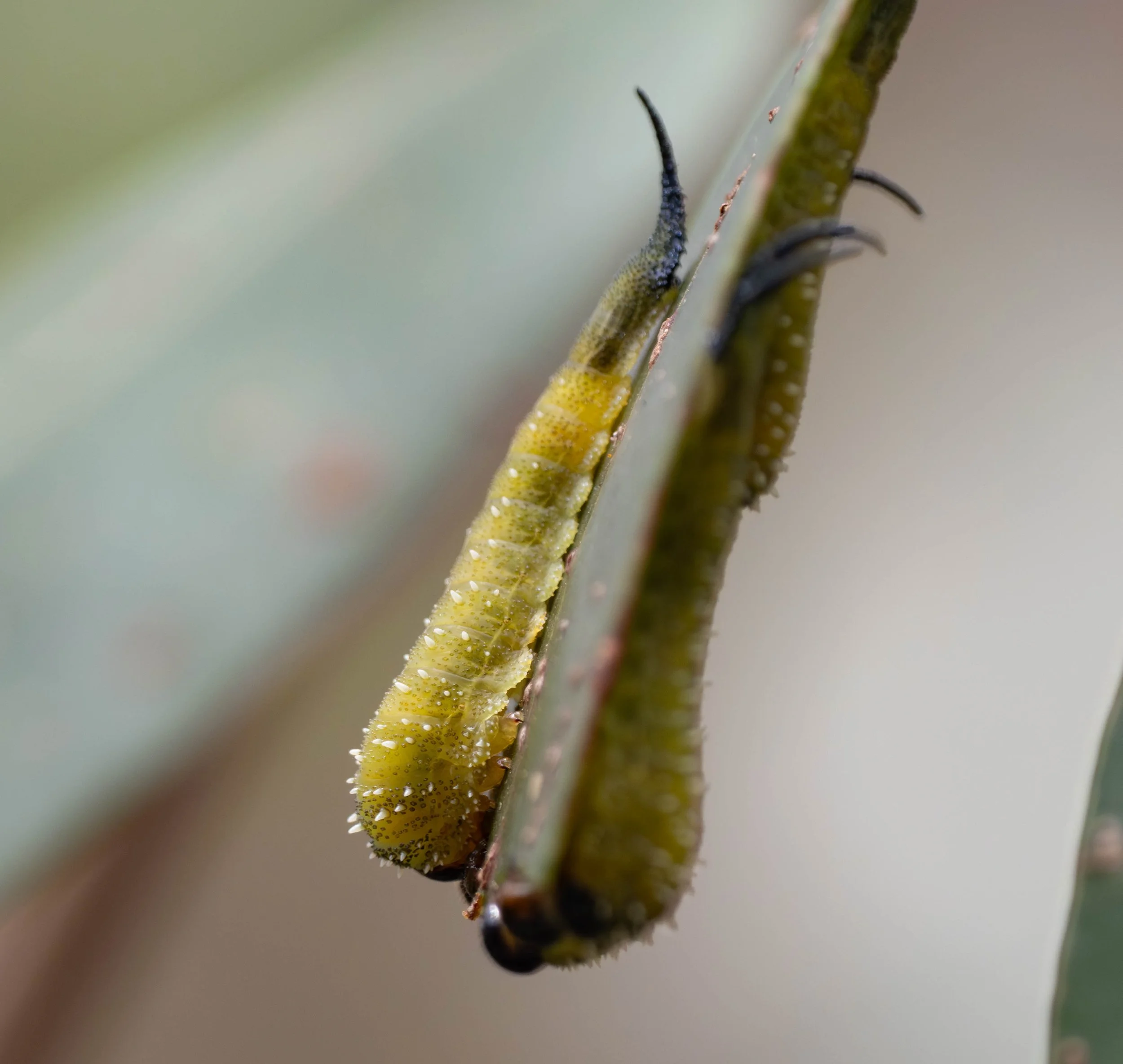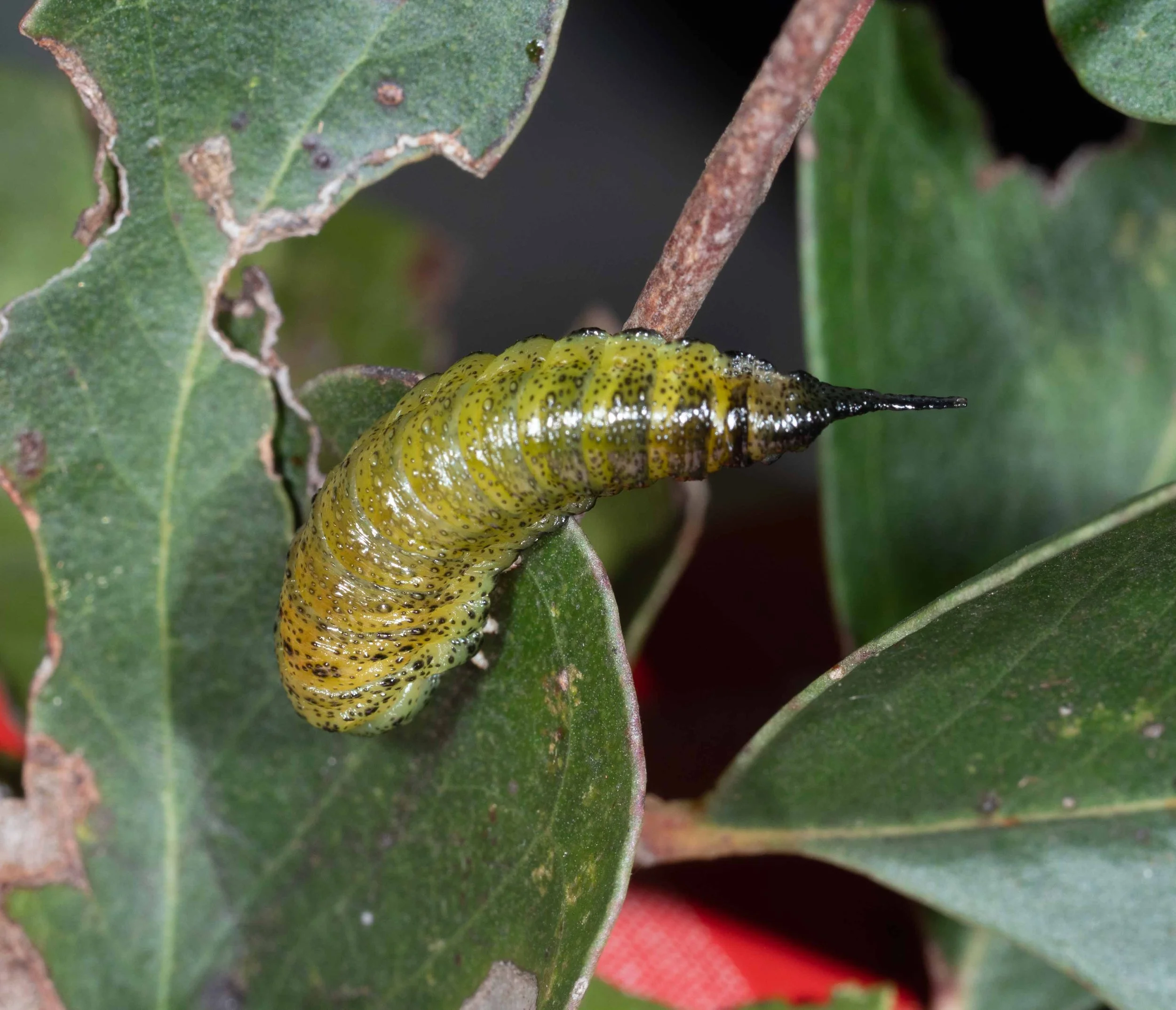 Five larvae seen feeding on a leaf on a epicormic branch of Eucalyptus globoidea tree with a broken trunk in driveway, near new water tank