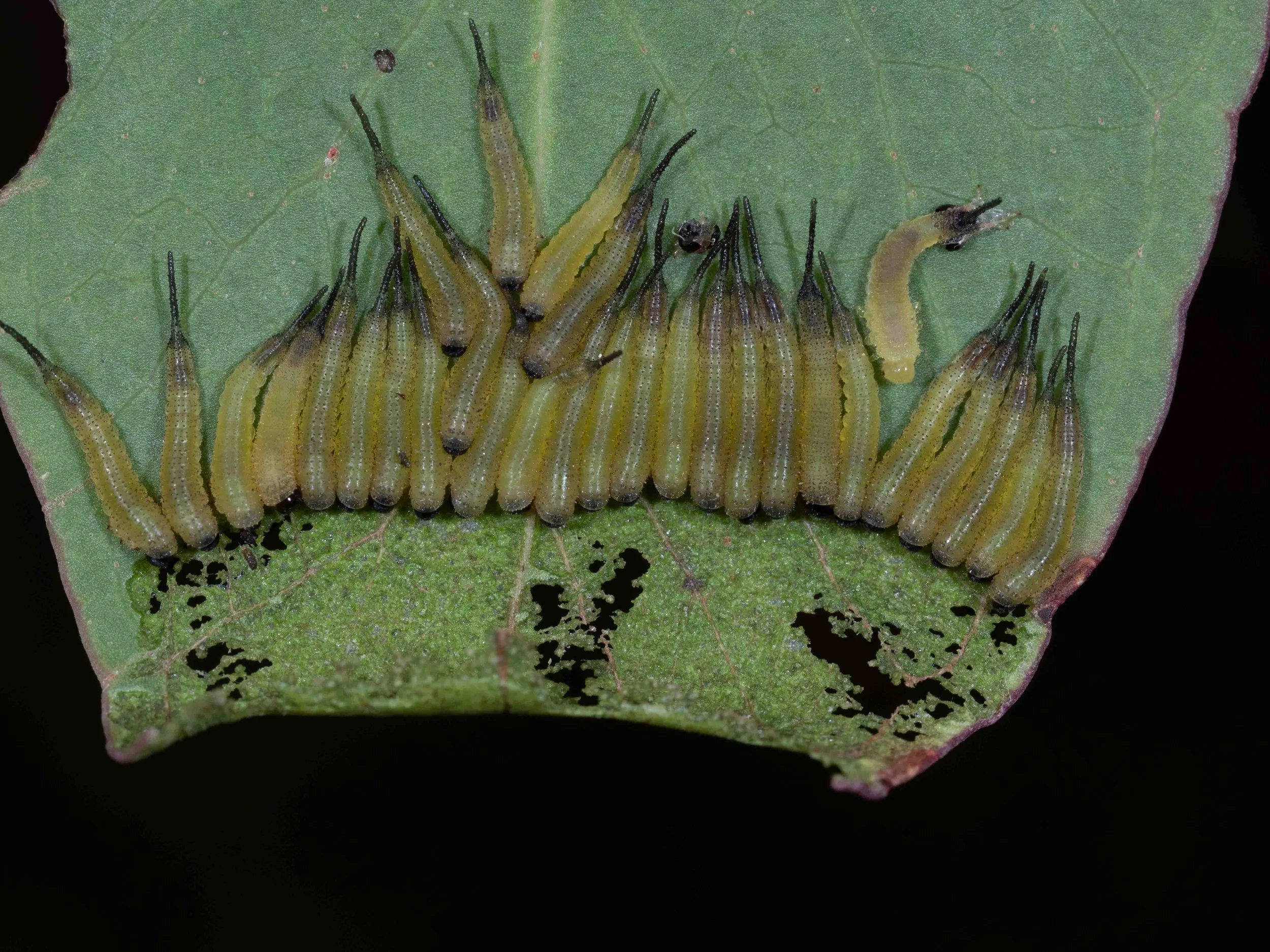 3 larvae found - on one leaf. moved them inside to the cage, placed the branch on which they were found in a jar of water with a lid with holes