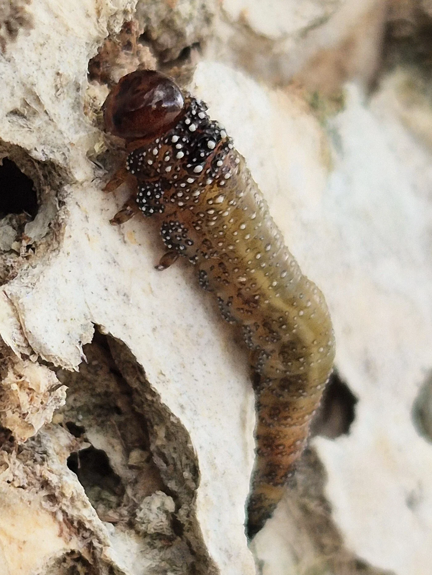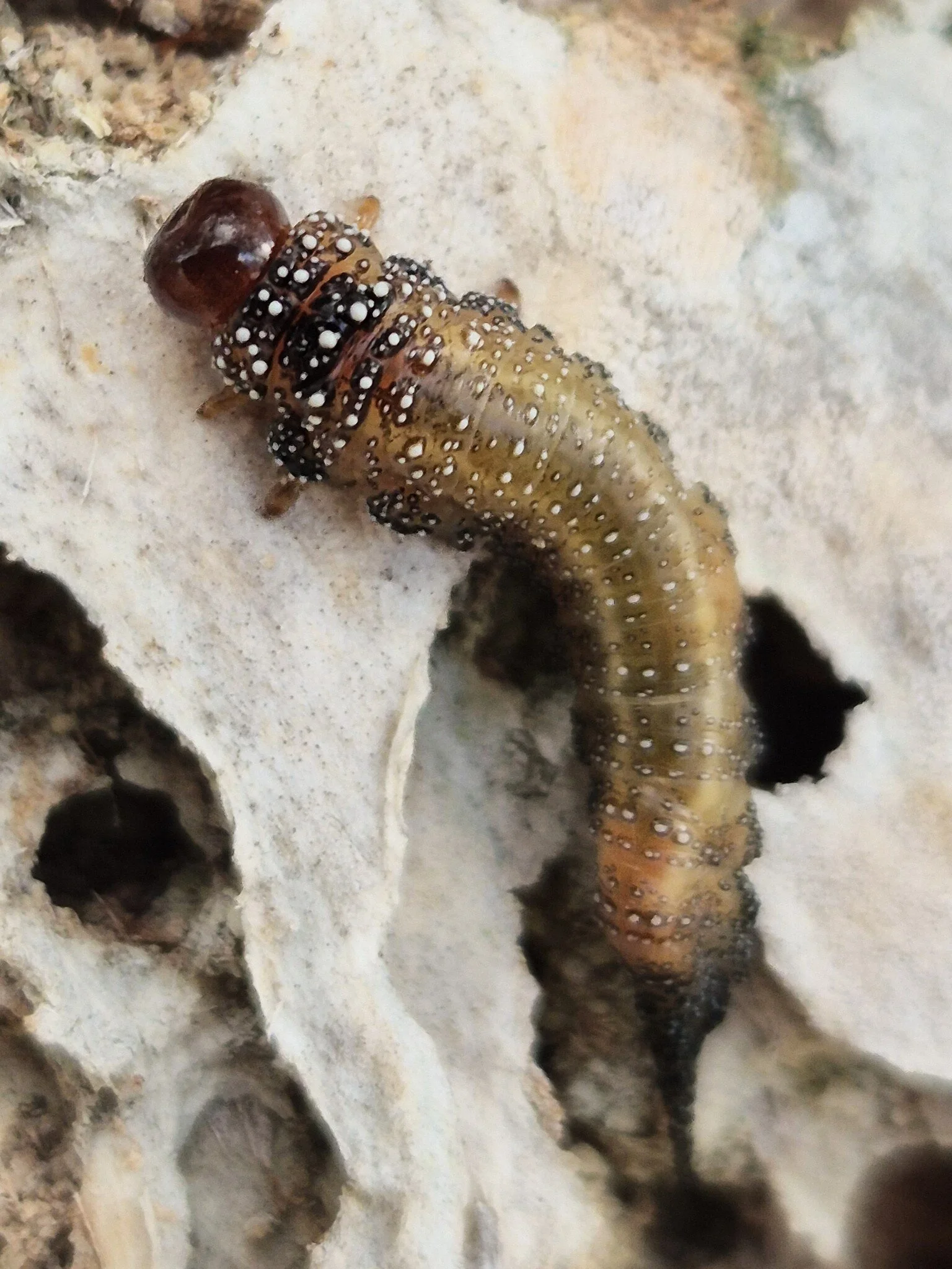 The head is orange-brown and the body has a whitish appearance and the internal organs and gut contents shine through the translucent cuticle, giving the larva a slightly greenish colour. Only the first thoracic segment dorsally apex differ in colour, being more or less yellow. The entire body is covered with black spots (Fig. 8)”