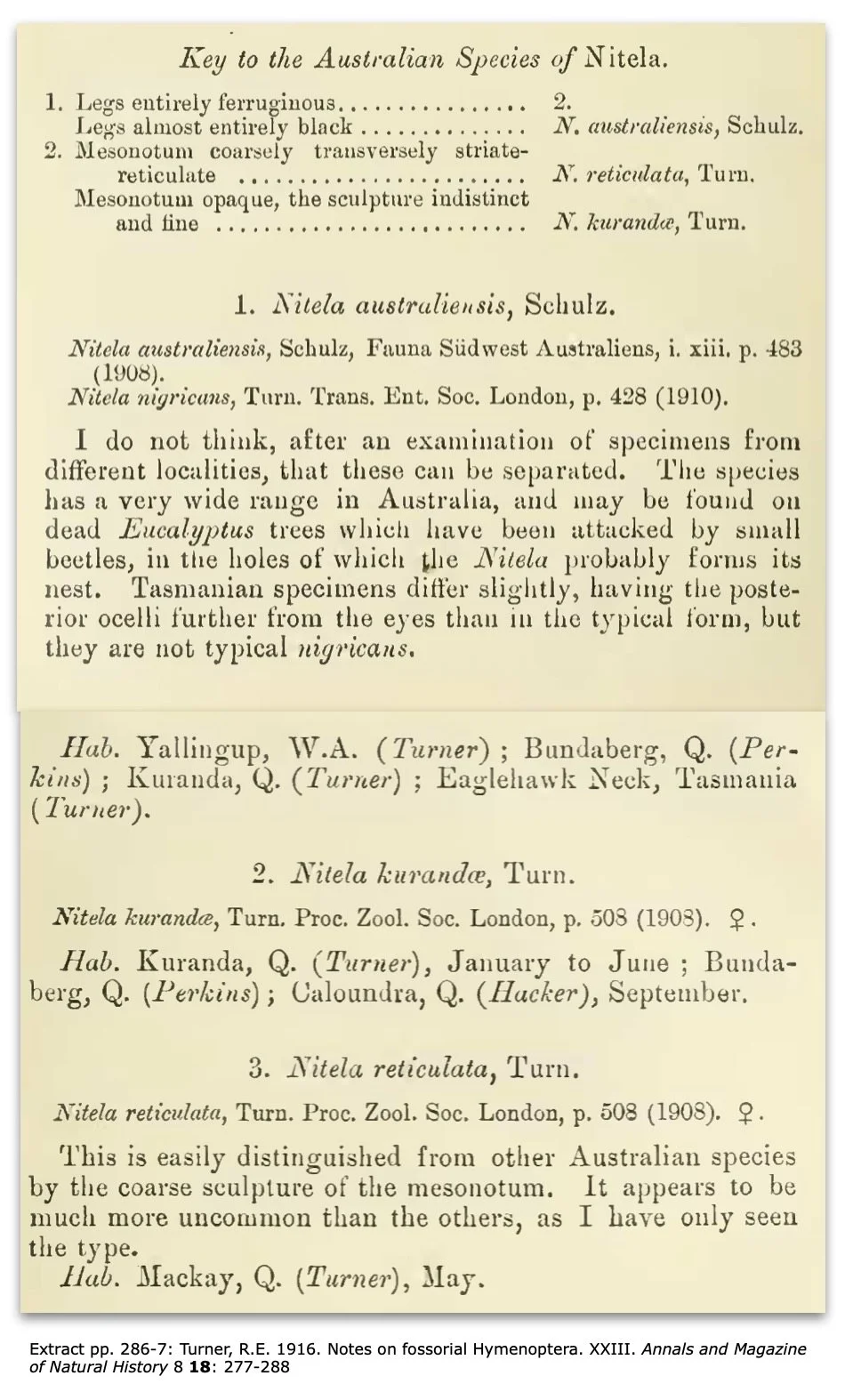 Turner, R.E. 1916. Notes on fossorial Hymenoptera, xxiv. On the genus Nitela Latr. Annals and Magazine of Natural History 8 18: 343-345
