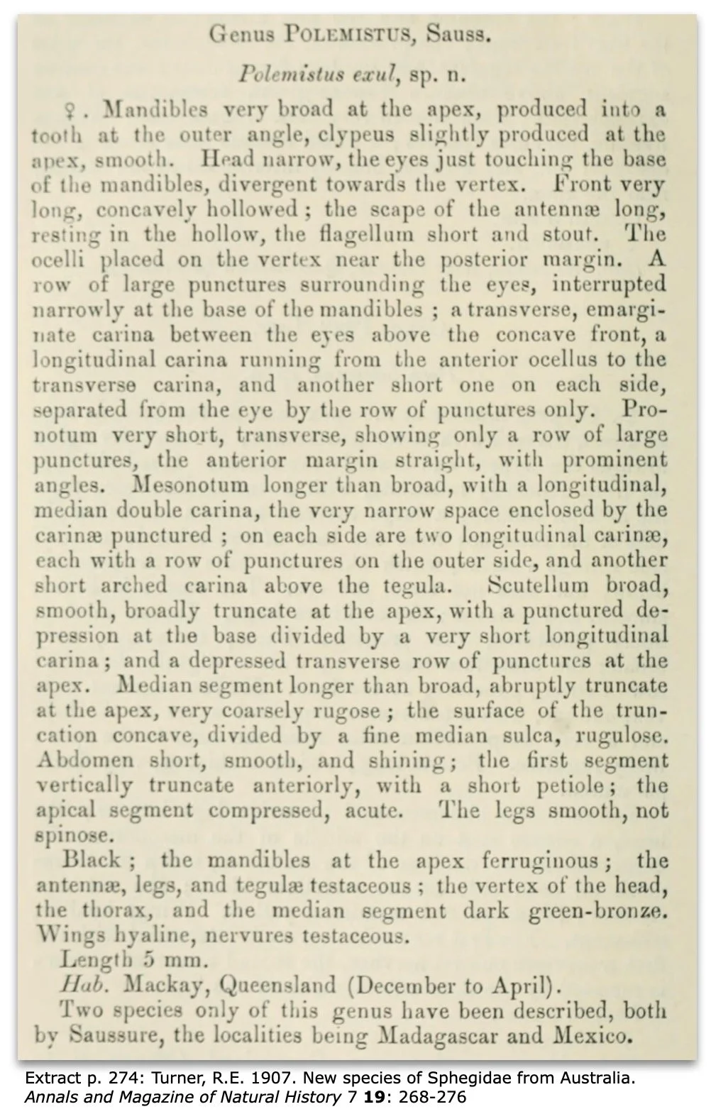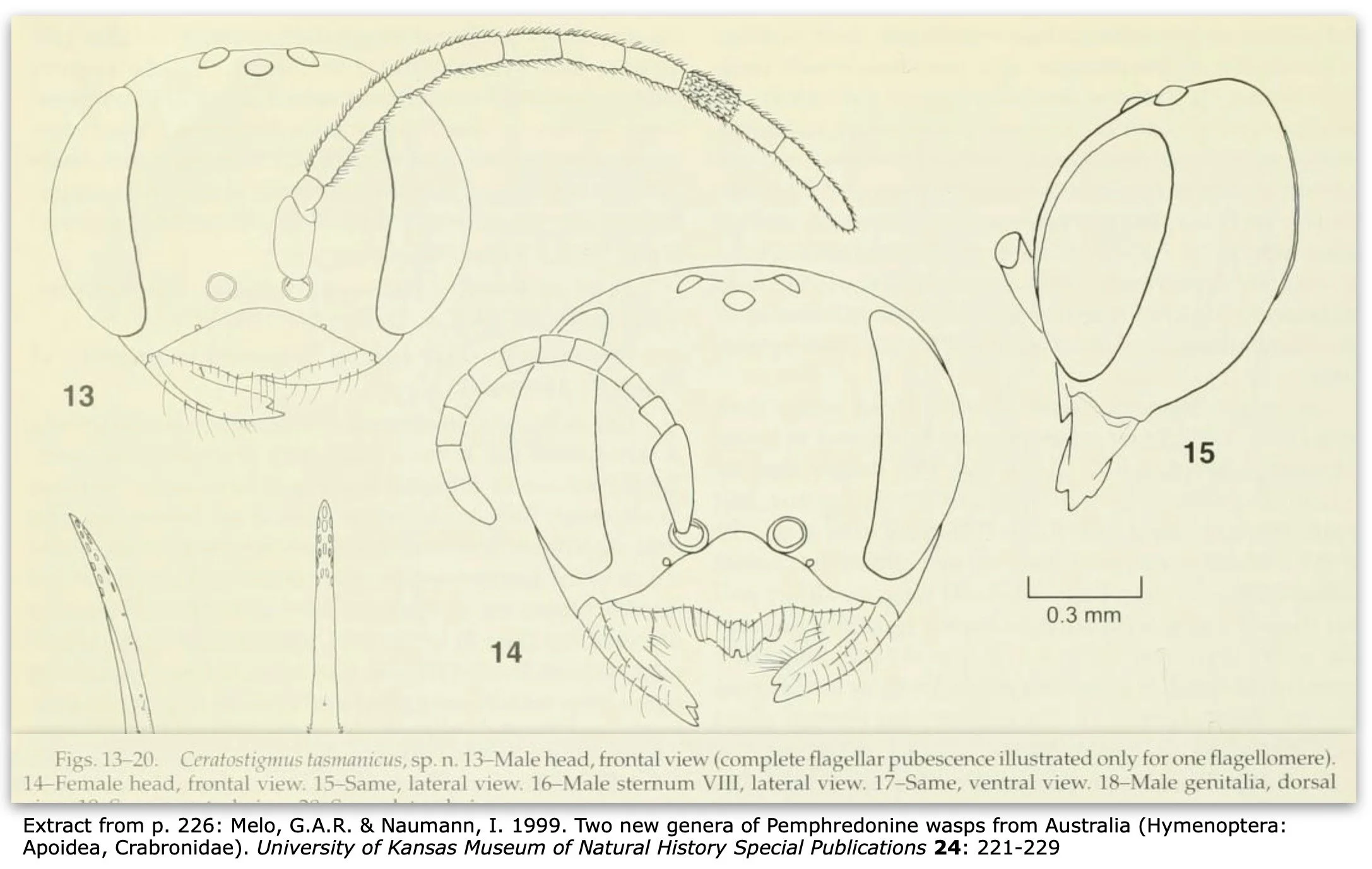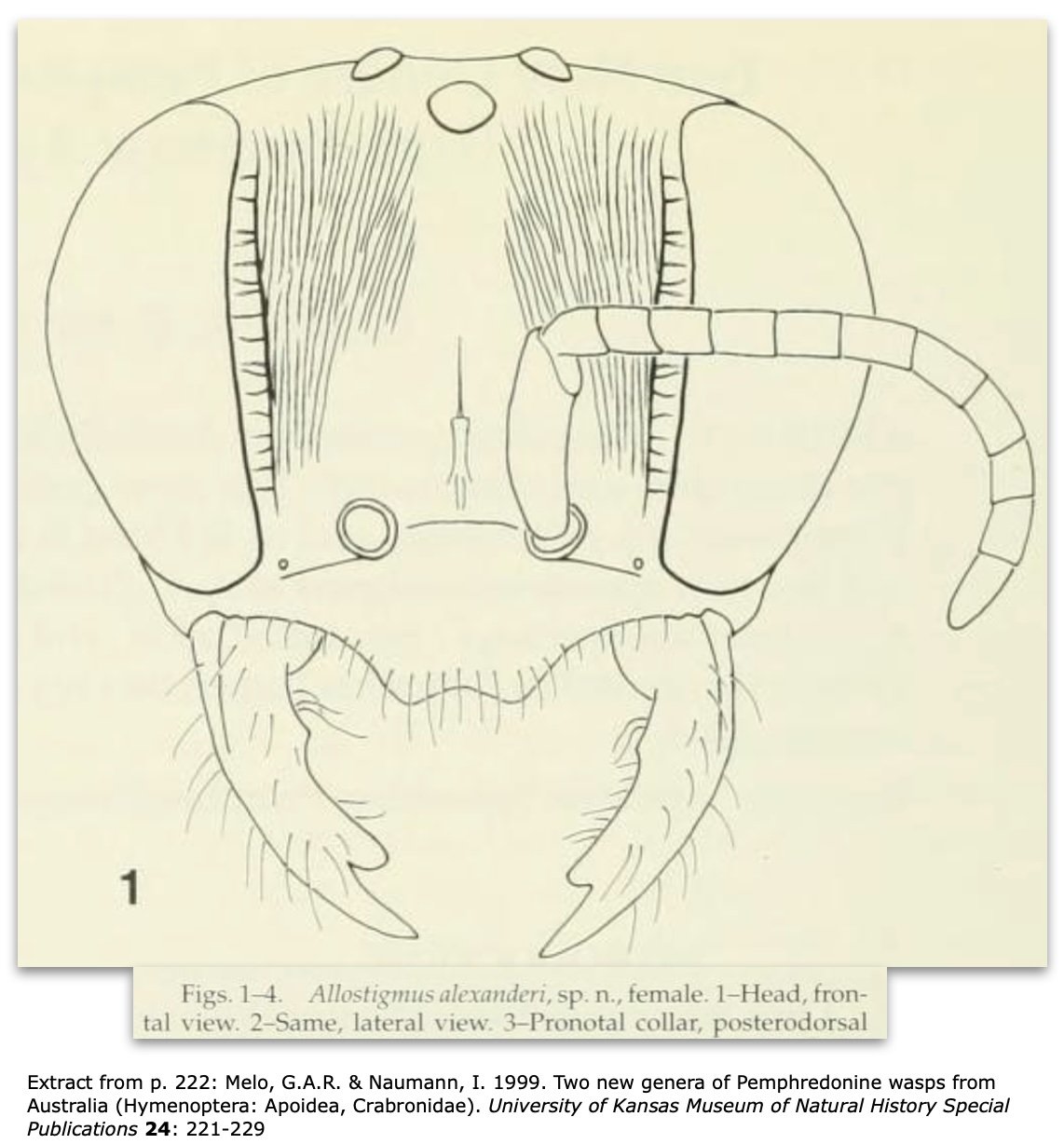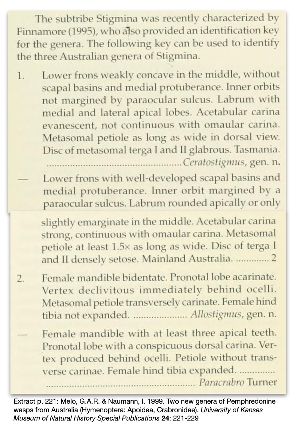 Melo, G.A.R. & Naumann, I. 1999. Two new genera of pemphredonine wasps from Australia (Hymenoptera: Apoidea, Crabronidae). University of Kansas Natural History Museum Special Publication 24: 221-229 freely available from BHL