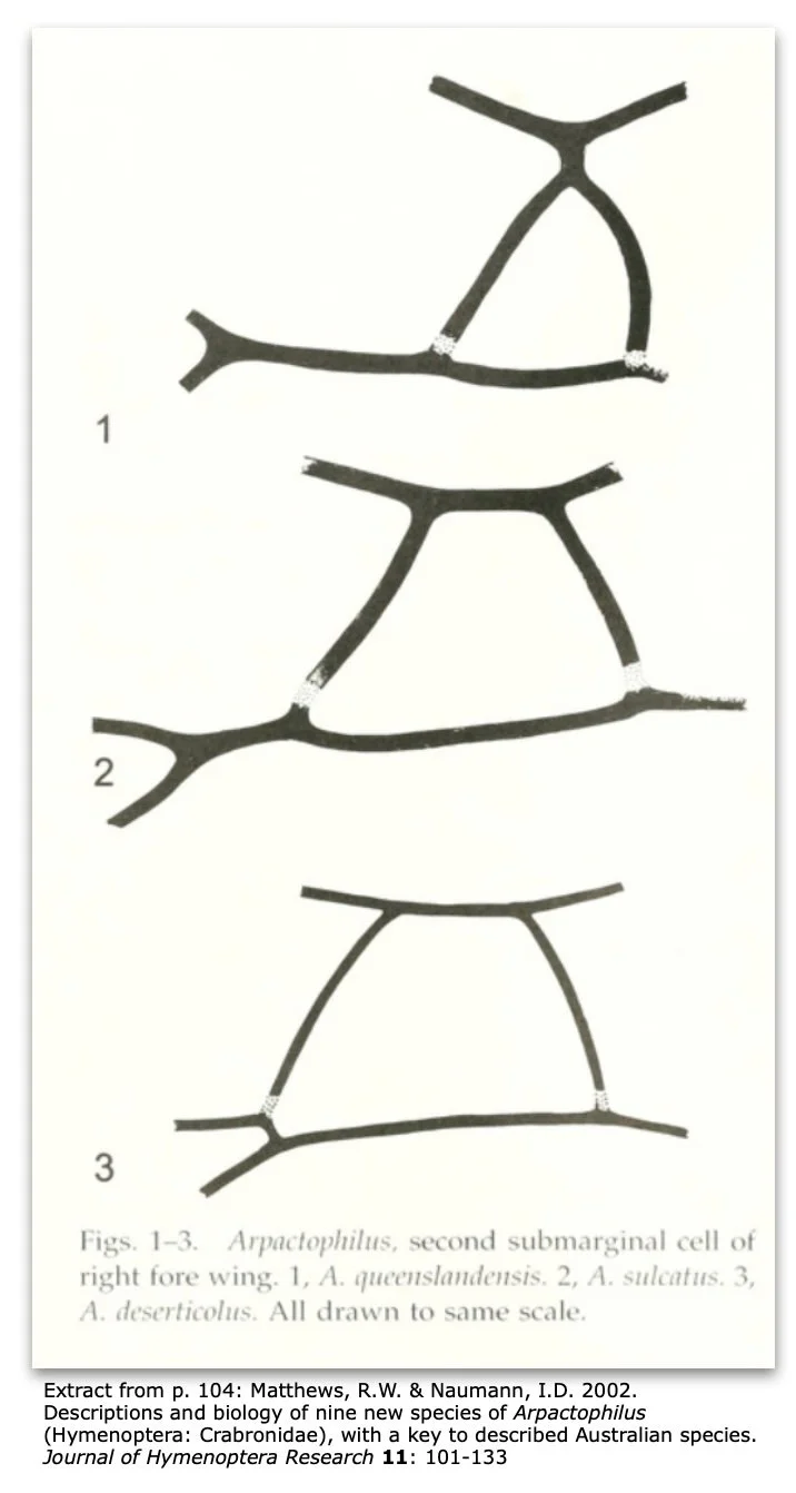 Matthews, R.W. & Naumann, I.D. 2002. Descriptions and biology of nine new species of Arpactophilus (Hymenoptera: Crabronidae), with a key to described Australian species. Journal of Hymenopteran Research 11(1): 101-133 freely available from BHL