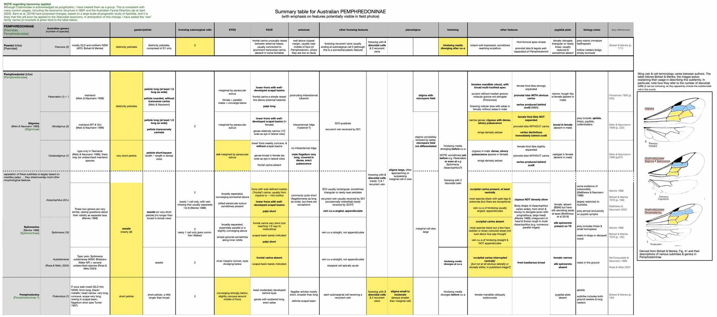 There are just 8 genera of Pemphredoninae in Australia. Psenulus is quite distinct, and under taxonomic changes proposed by Sann et al. (2018), it will move to an entirely separate family. Among the remaining seven (tribe Pemphredonini), Arpactophilus dominates in terms of species numbers.