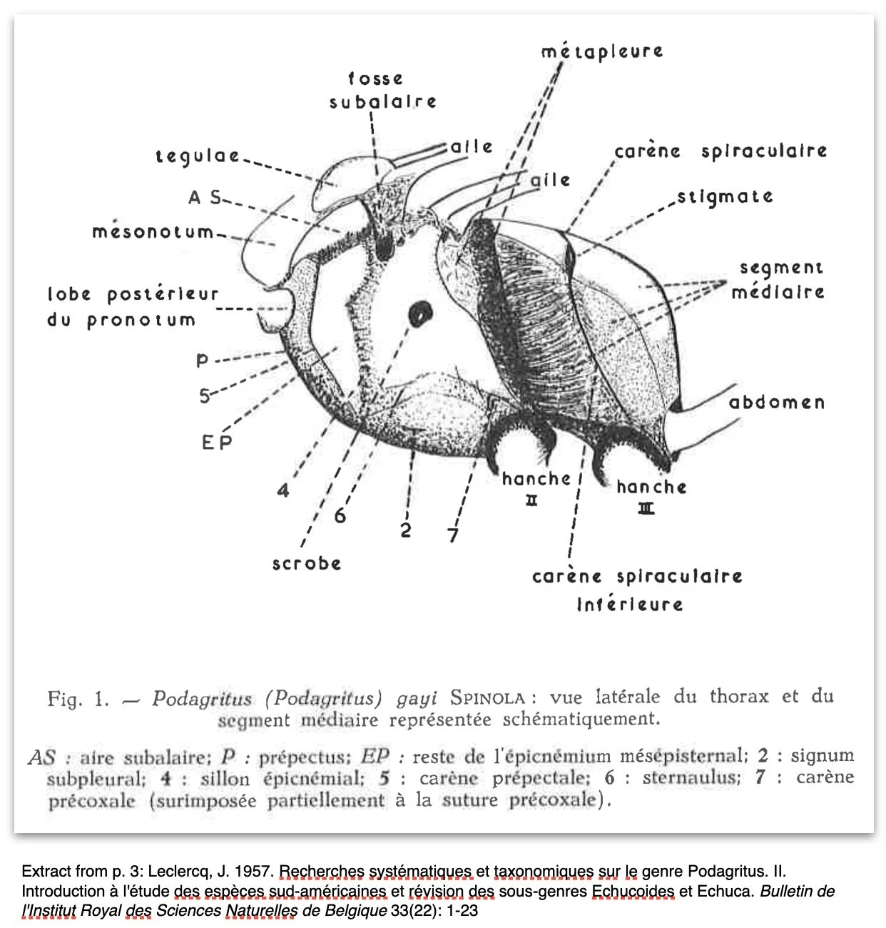 Leclercq, J. 1957. Recherches systématiques et taxonomiques sur le genre Podagritus. II. Introduction à l'étude des espèces sud-américaines et révision des sous-genres Echucoides et Echuca. Bulletin de l'Institut Royal des Sciences Naturelles de Belgique 33(22): 1-23