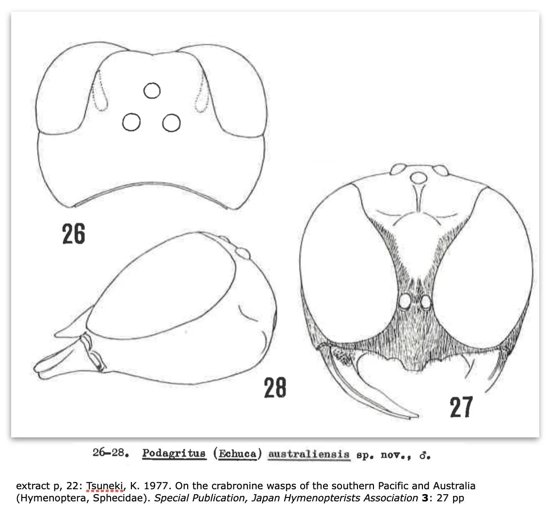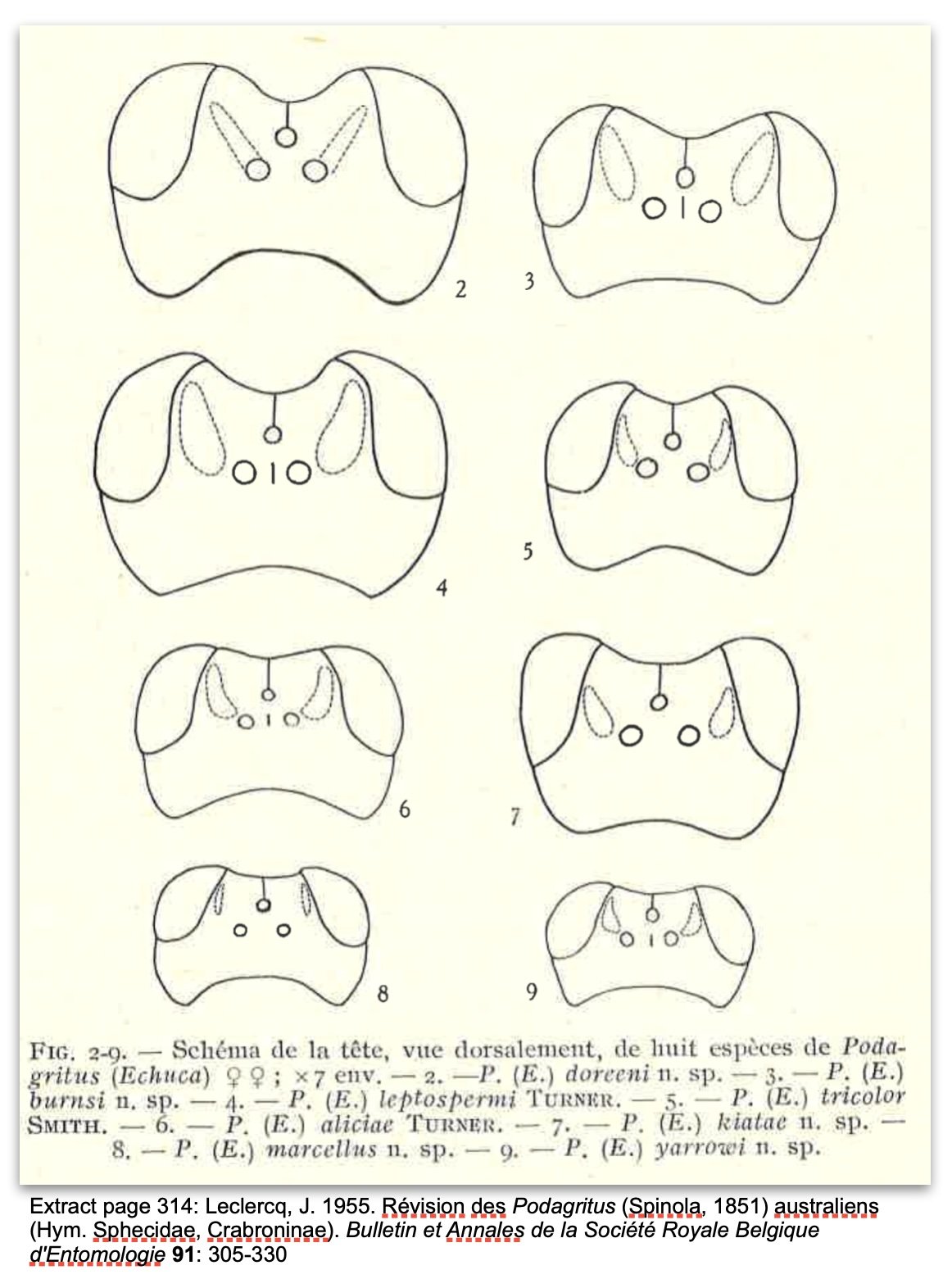 Leclercq, J. 1955. Révision des Podagritus (Spinola, 1851) australiens (Hym. Sphecidae, Crabroninae). Bulletin et Annales de la Société Royale Belgique d'Entomologie 91: 305-330