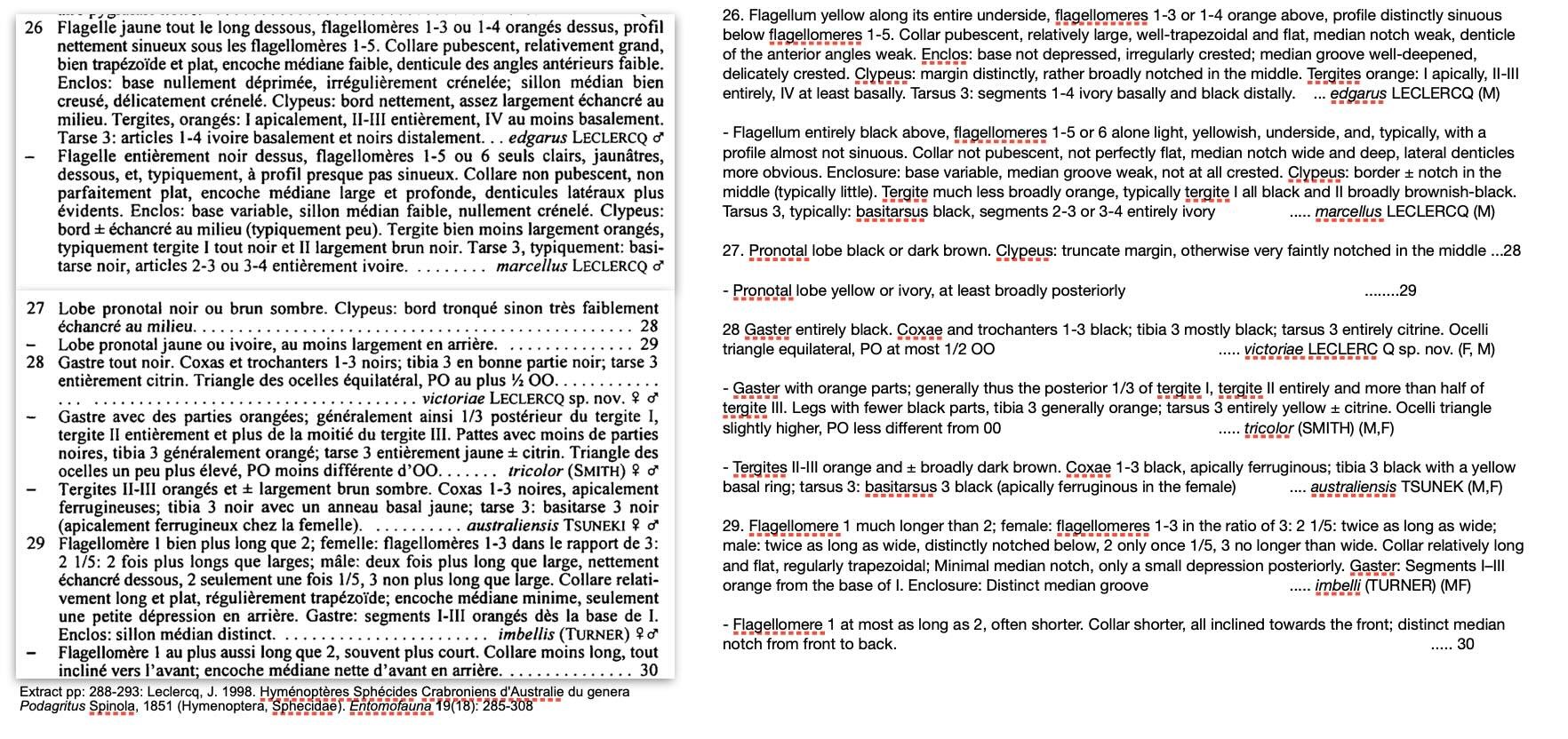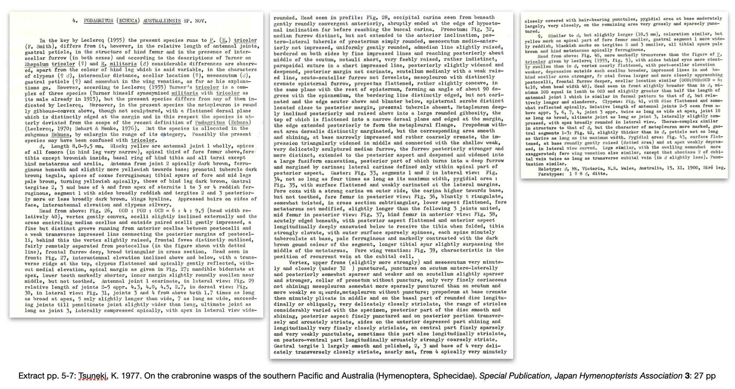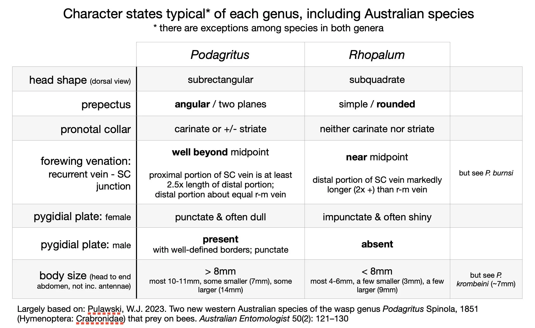 The majority of Australia’s Podagritus species were described by Leclercq (1955, 1957, 1970, 1998), with just six new species added since 1998, all from Western Australia (Pulawski 2023, 2025). In preparing the summary table below I am therefore relying heavily upon Leclercq’s most recent revision (Leclercq 1998).