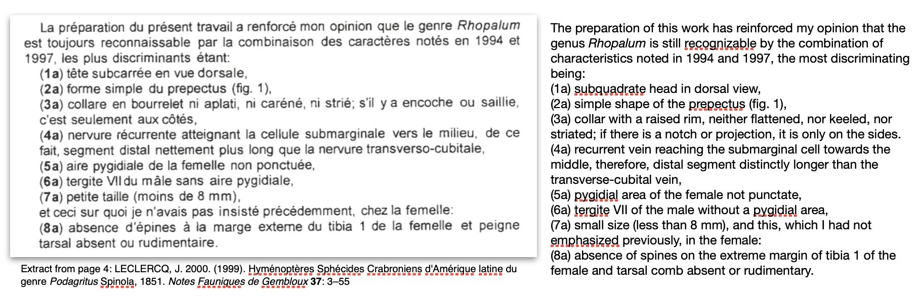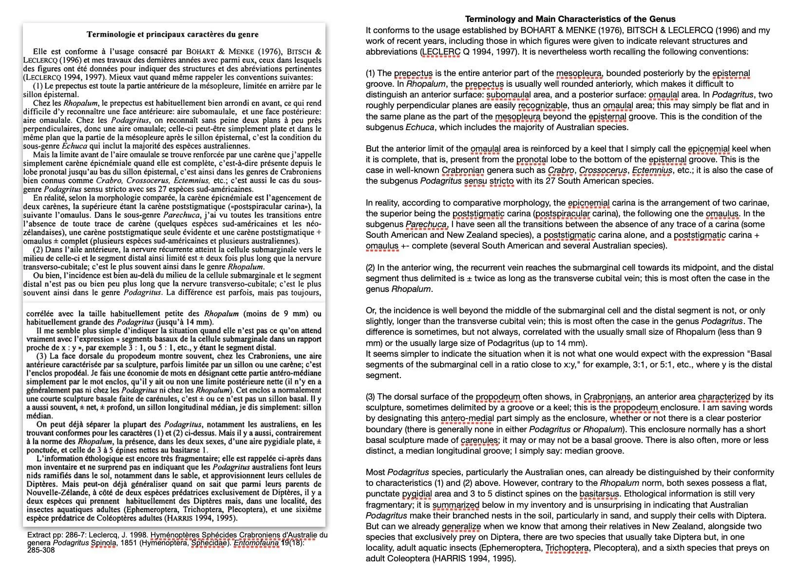 Leclercq, J. 1970. Quelques Podagritus d'Australie et d'Amérique du Sud (Hymenoptera Sphecidae, Crabroninae). Bulletin des Recherches Agronomiques de Gembloux ns 5: 271-280