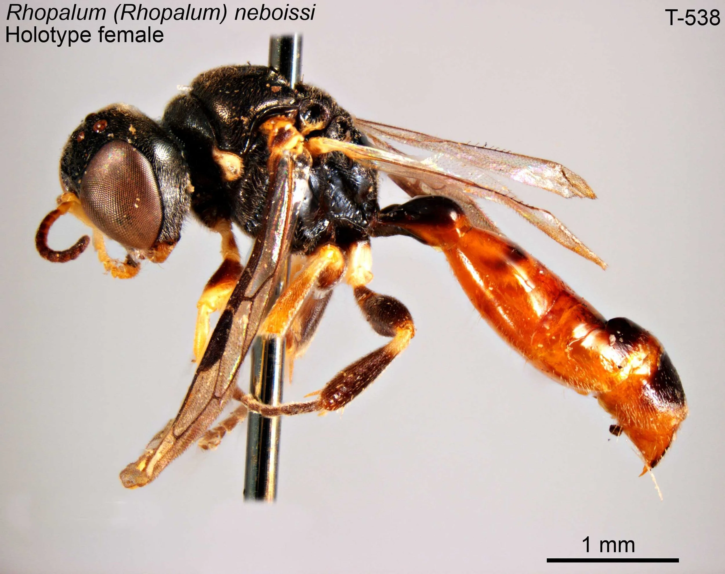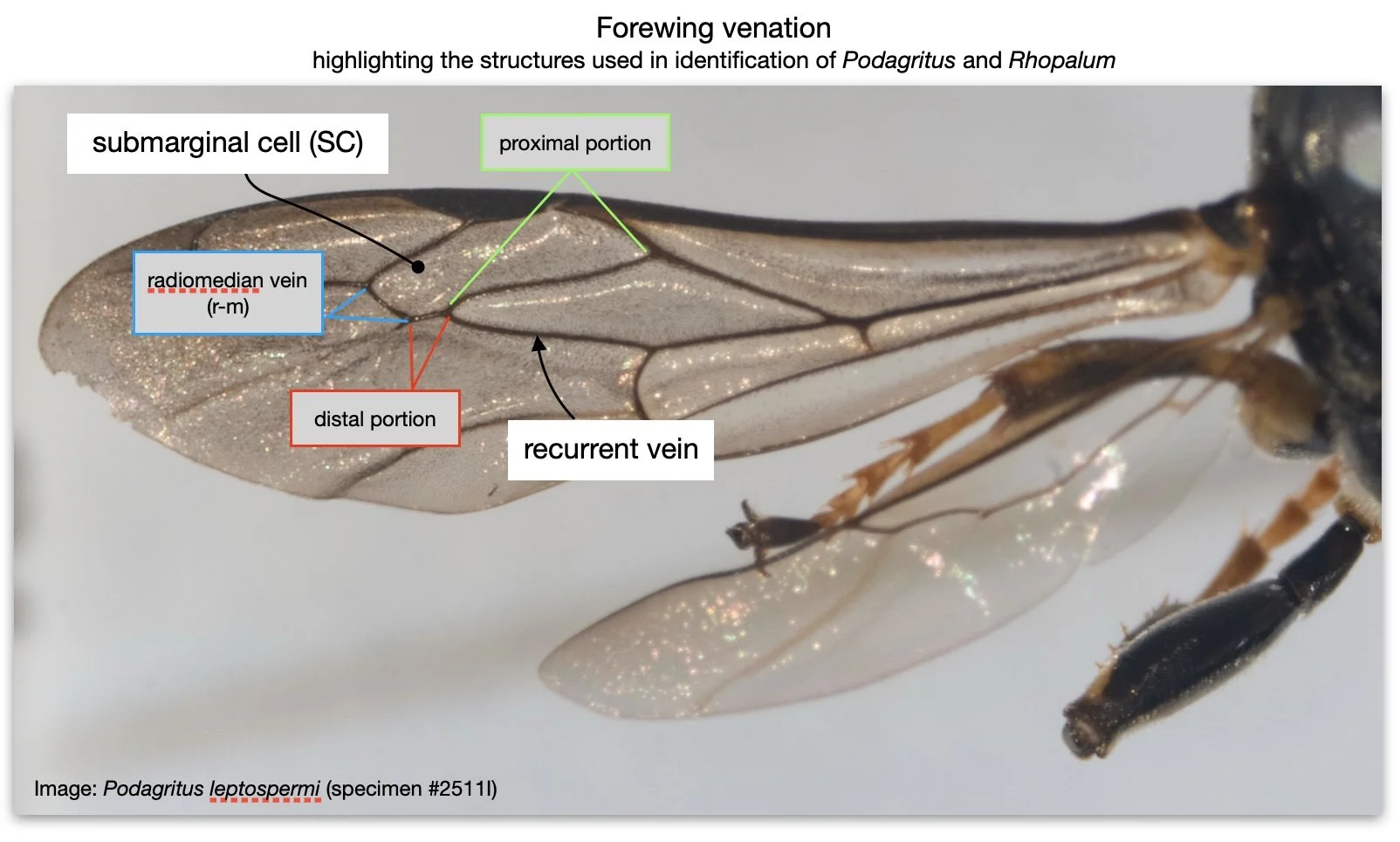 In contrast, in most Rhopalum the junction is at the midpoint or slightly beyond. But as this may vary considerably (cf Rhopalum examples below), it is important to also compare the relative lengths of the distal portion and the r-m vein. In Podagritus these are nearly equal in length, whereas in Rhopalum the distal portion is usually at least twice the length of r-m).