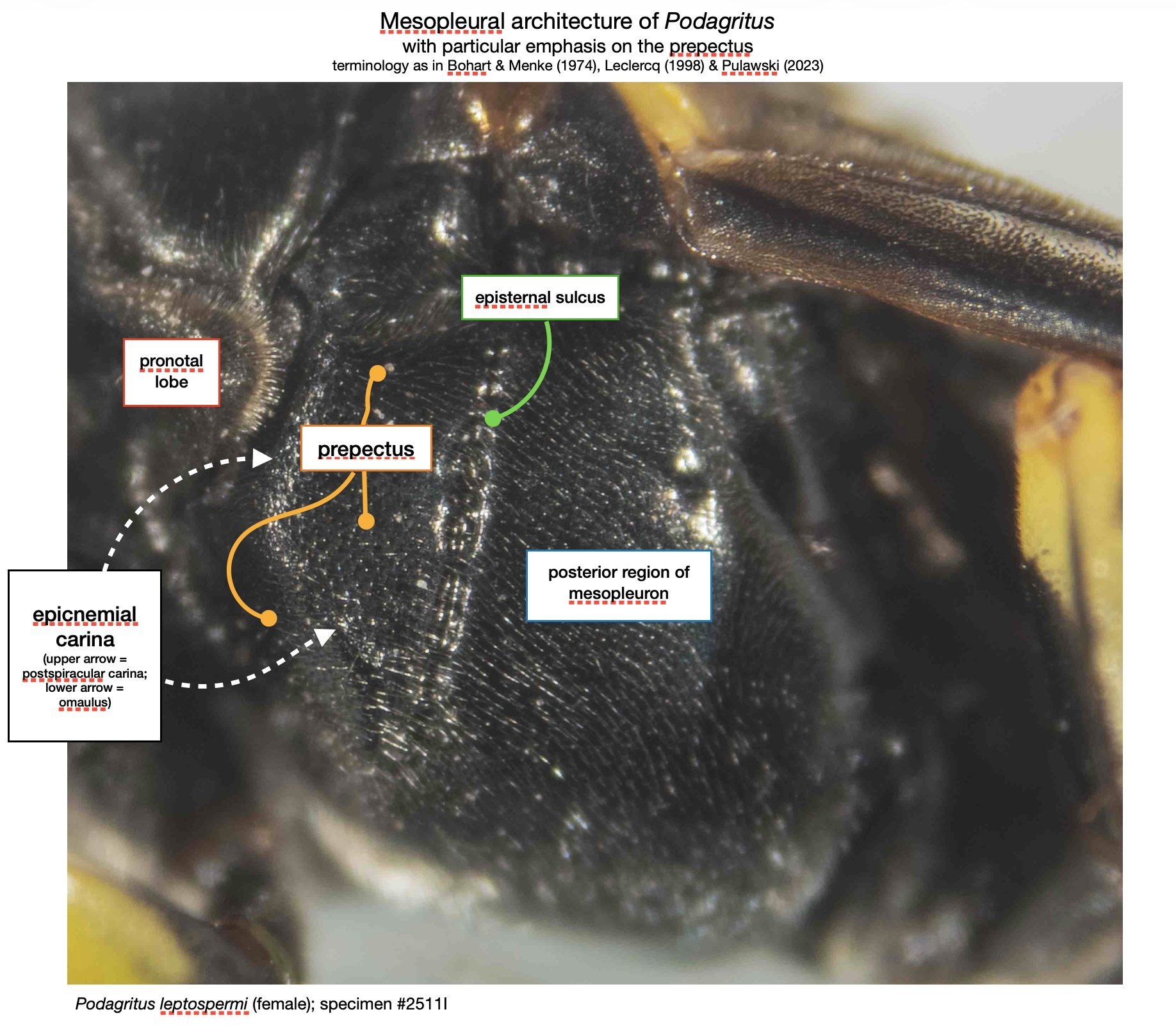 The first challenge is identifying the relevant parts of the mesopleuron. Different authors adopt different terminology, and even Leclercq has applied different names for the same structures over the years. So … a schematic and a correspondingly labelled image: