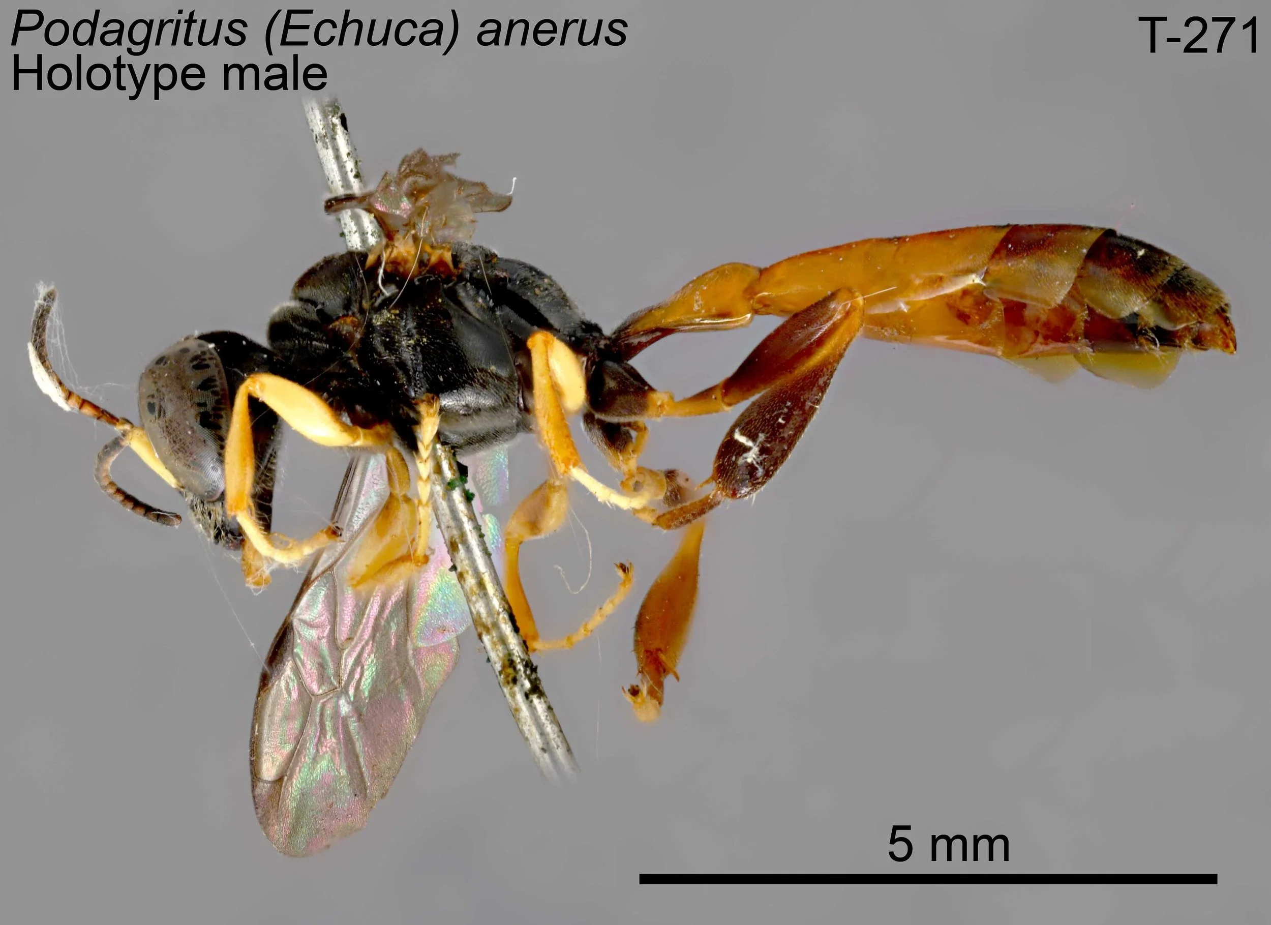 In nearly all Australian Podagritus (i.e. subgenus Echuca), the pronotal collar is large, flat, and in roughly the same plane as the mesoscutum – which is itself relatively flat. This contrasts with most Rhopalum, in which the mesoscutum is strongly rounded and often almost arched forward anteriorly.