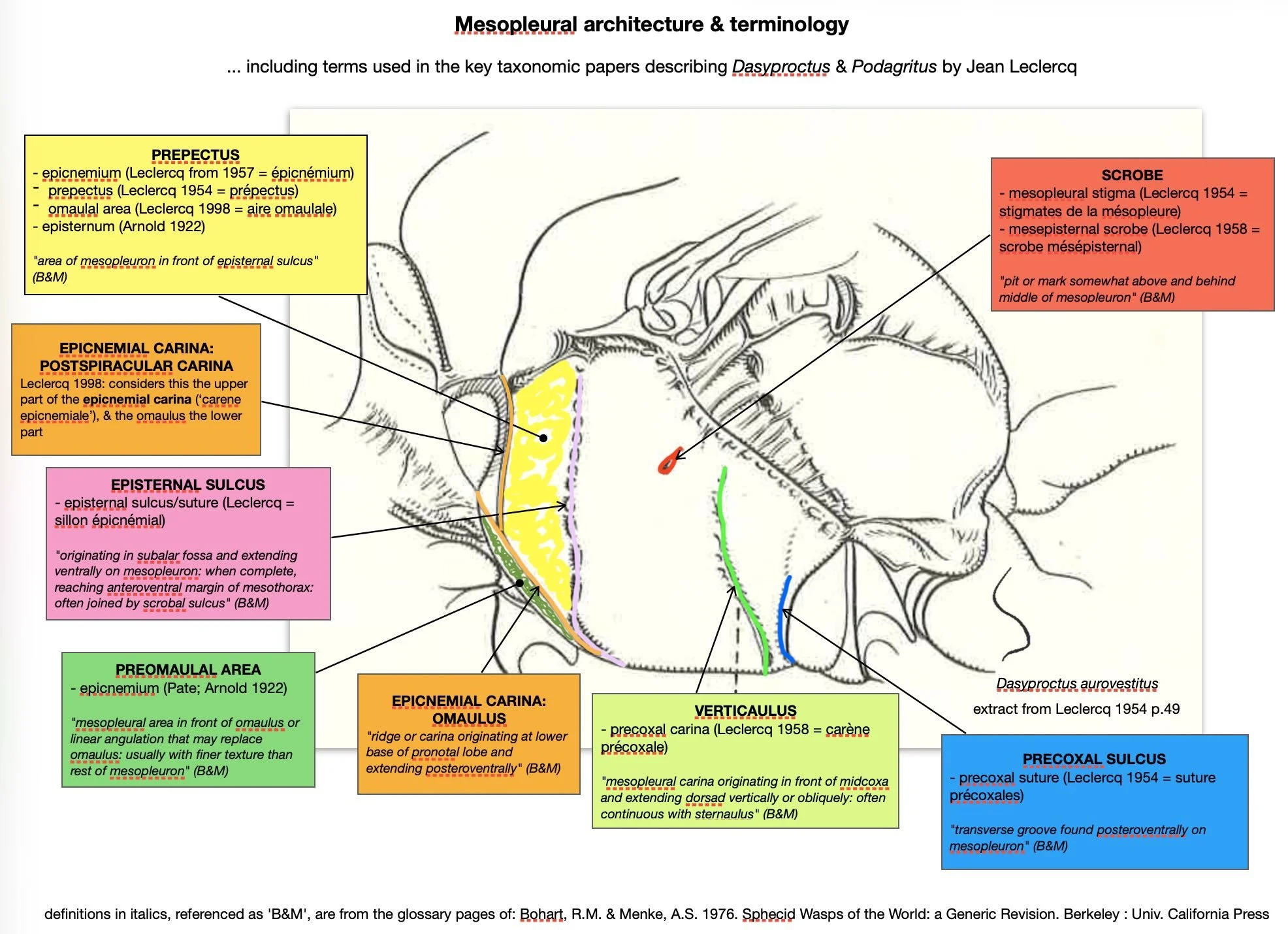 Much of what I need to know to discriminate between Australia’s 46 genera is available in a single publication … thanks to the mammoth efforts of Bohart & Menke (1976)! This remarkable treatise – all 695 pages of it – is among the references I most value. Lately I’ve been using the introductory chapters to untangle the complexities of thoracic morphology and the plethora of different terms employed by different authors.